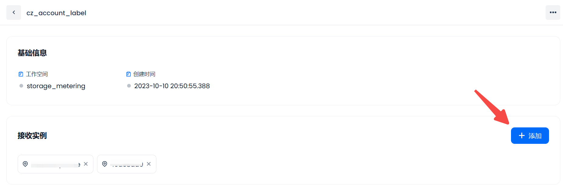 4)在接收实例行,点击“添加”。输入需要接收数据的服务实例名称。服务实例名称在Lakehouse服务中全局唯一。服务消费端用户可在首页右侧或在服务实例的URL中找到自己的服务实例名称并提供给分享者进行配置。