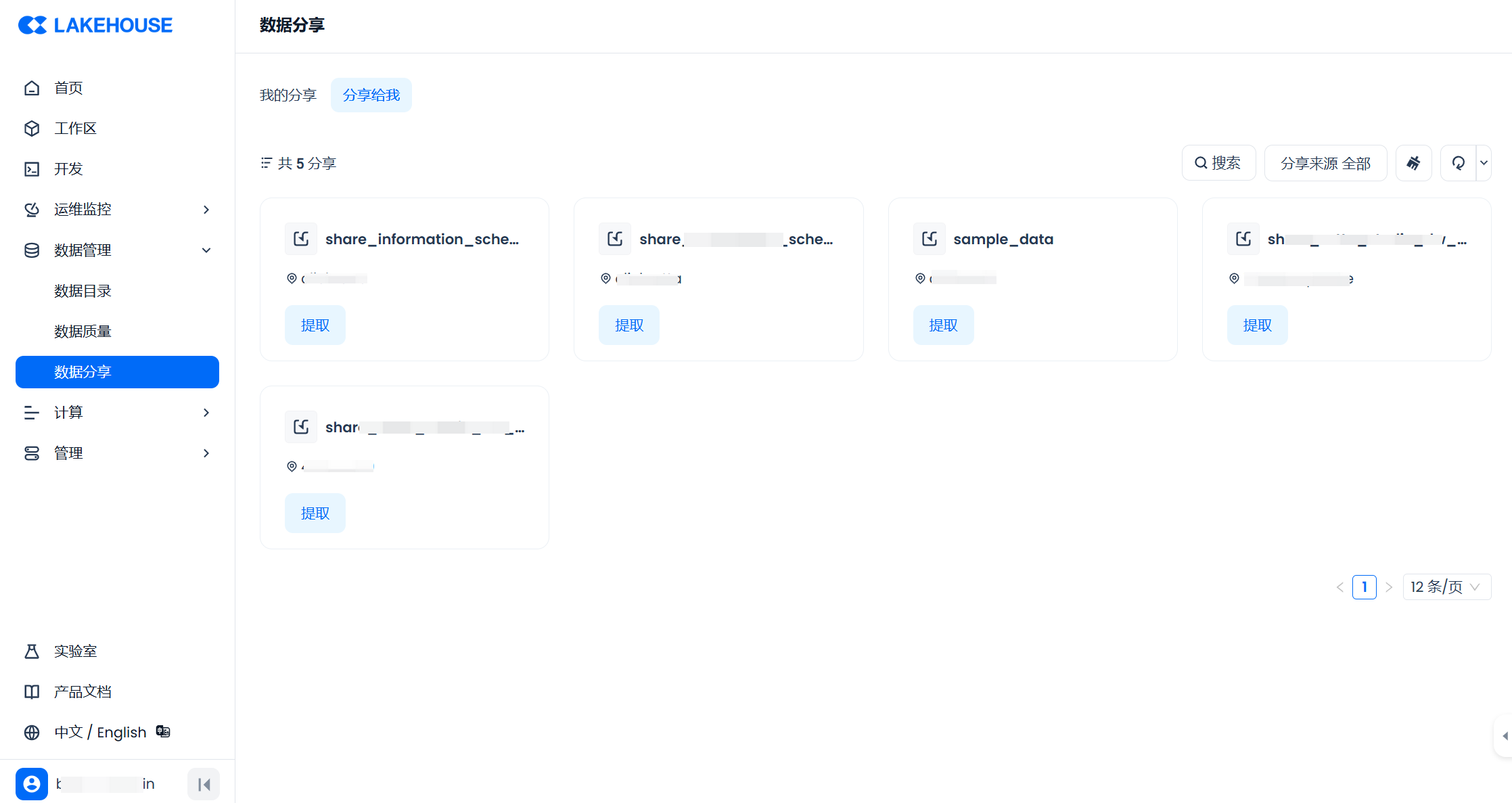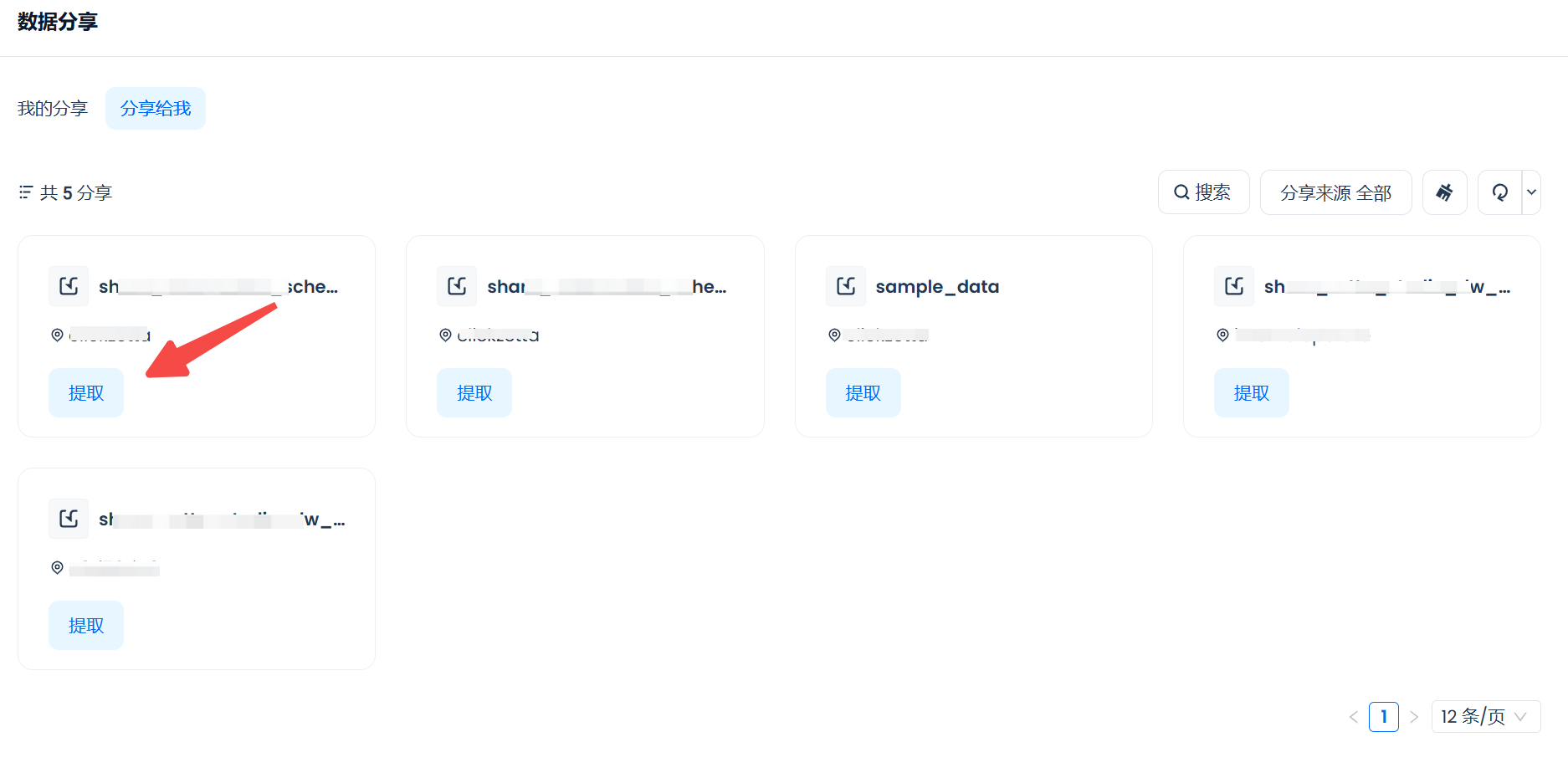 在“分享给我”的列表页,或数据分享对象的详情页面,点击“提取”按钮,即可提取该分享中的数据。