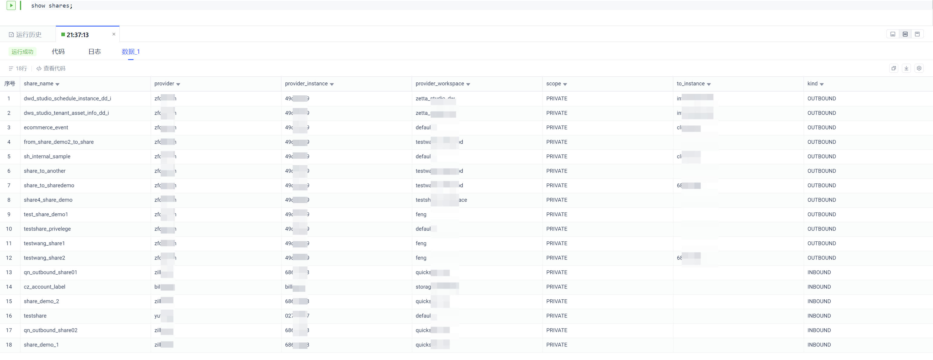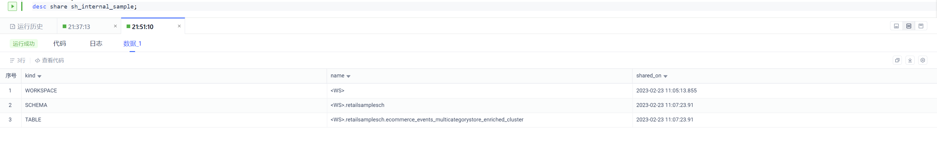 其中<provider_instance>和<share_name>可通过show shares命令的查询结果获得;<schema_name>可通过desc share <share_name>命令指定share名称查询获得。