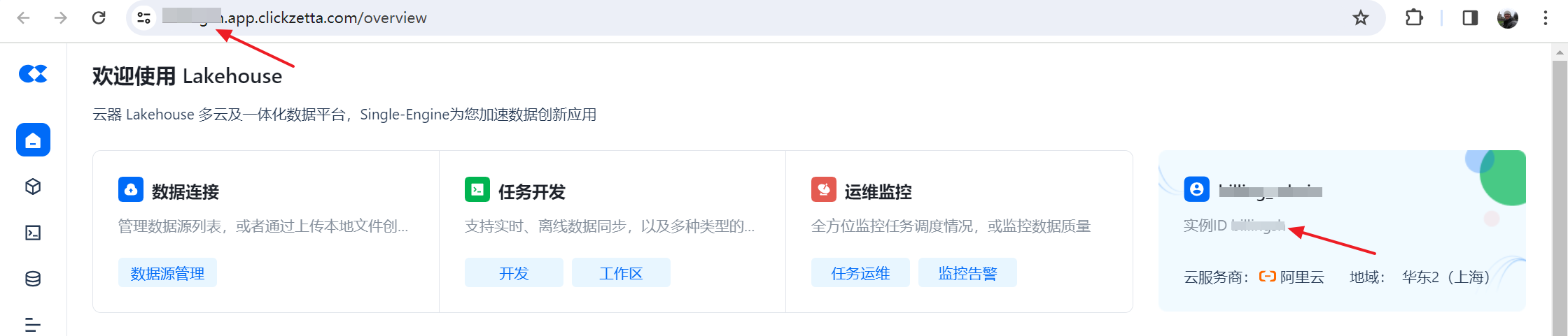 服务实例名称在Lakehouse服务中全局唯一。服务消费端用户可在首页右侧或在服务实例的URL中找到自己的服务实例名称并提供给分享者进行配置。