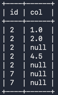 SELECT id, col FROM test_explode_json LATERAL VIEW explode_json_array_double(j) lv AS col ORDER BY id;