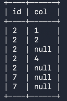 SELECT id, col FROM test_explode_json LATERAL VIEW explode_json_array_int(j) lv AS col ORDER BY id;