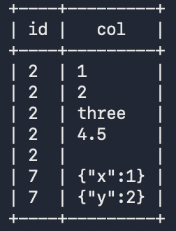 SELECT id, col FROM test_explode_json LATERAL VIEW explode_json_array_string(j) lv AS col ORDER BY id;