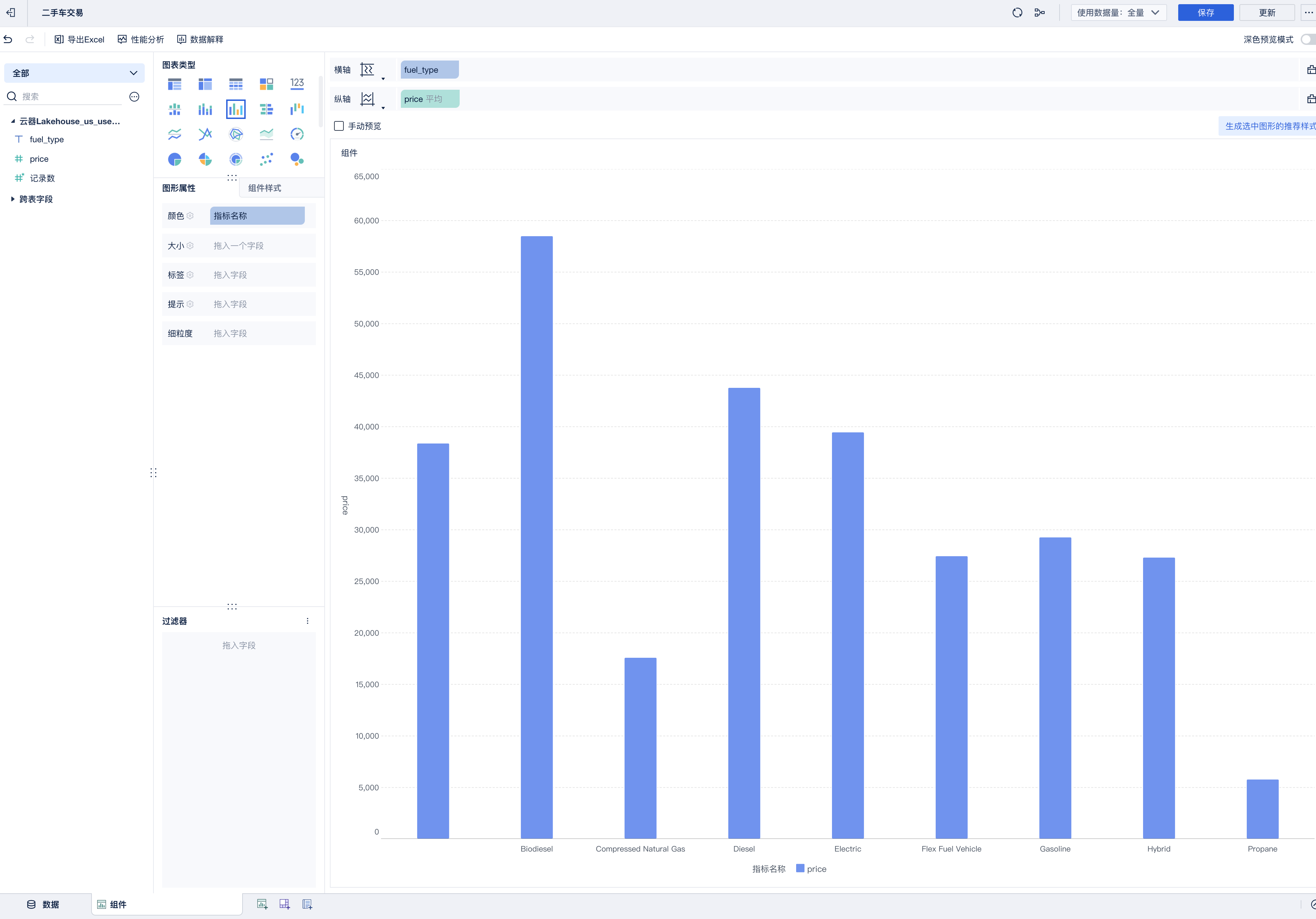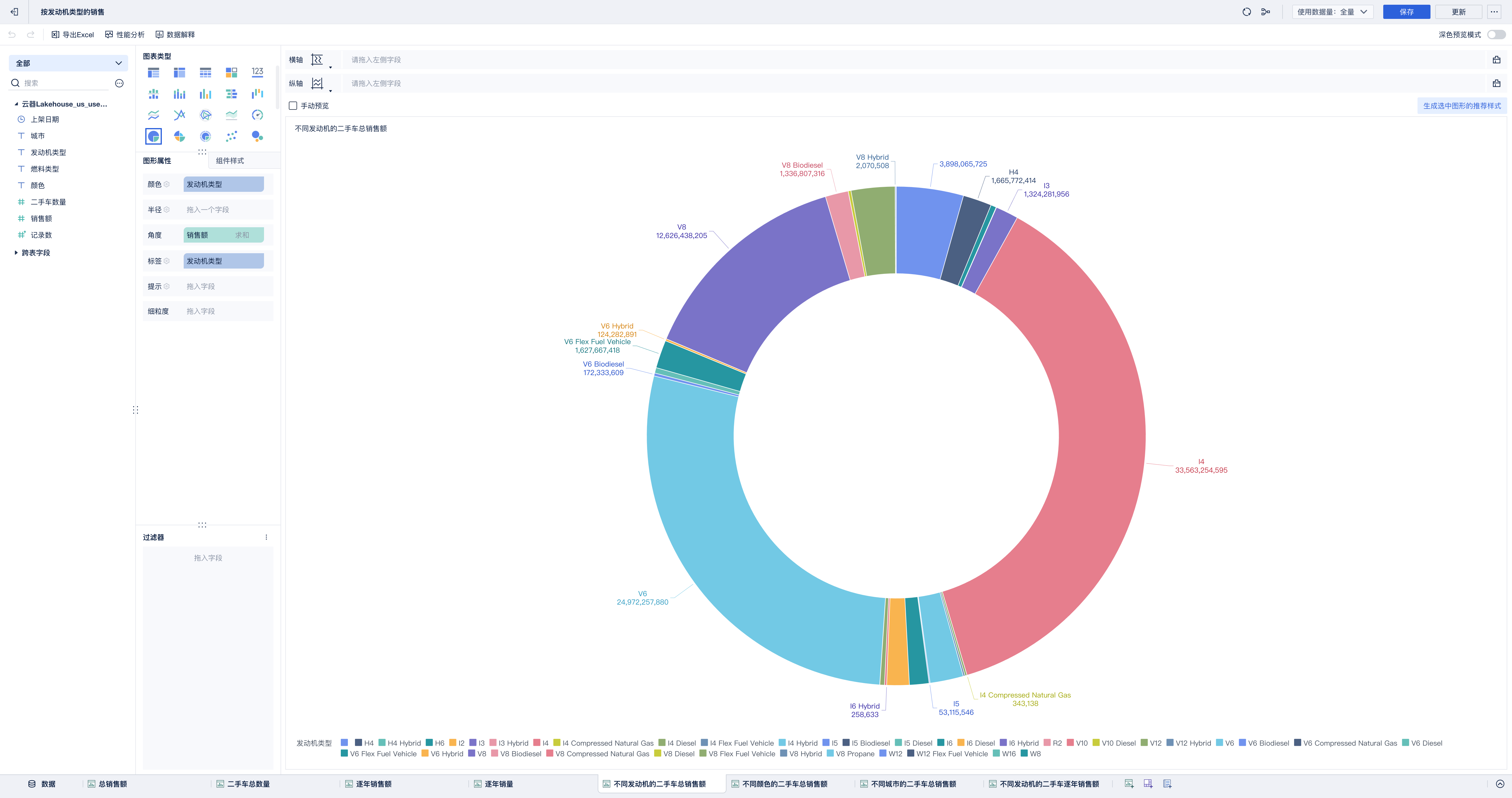 基于数据视图的可视化组件-饼图,分析不同发动机类型的二手车销售额