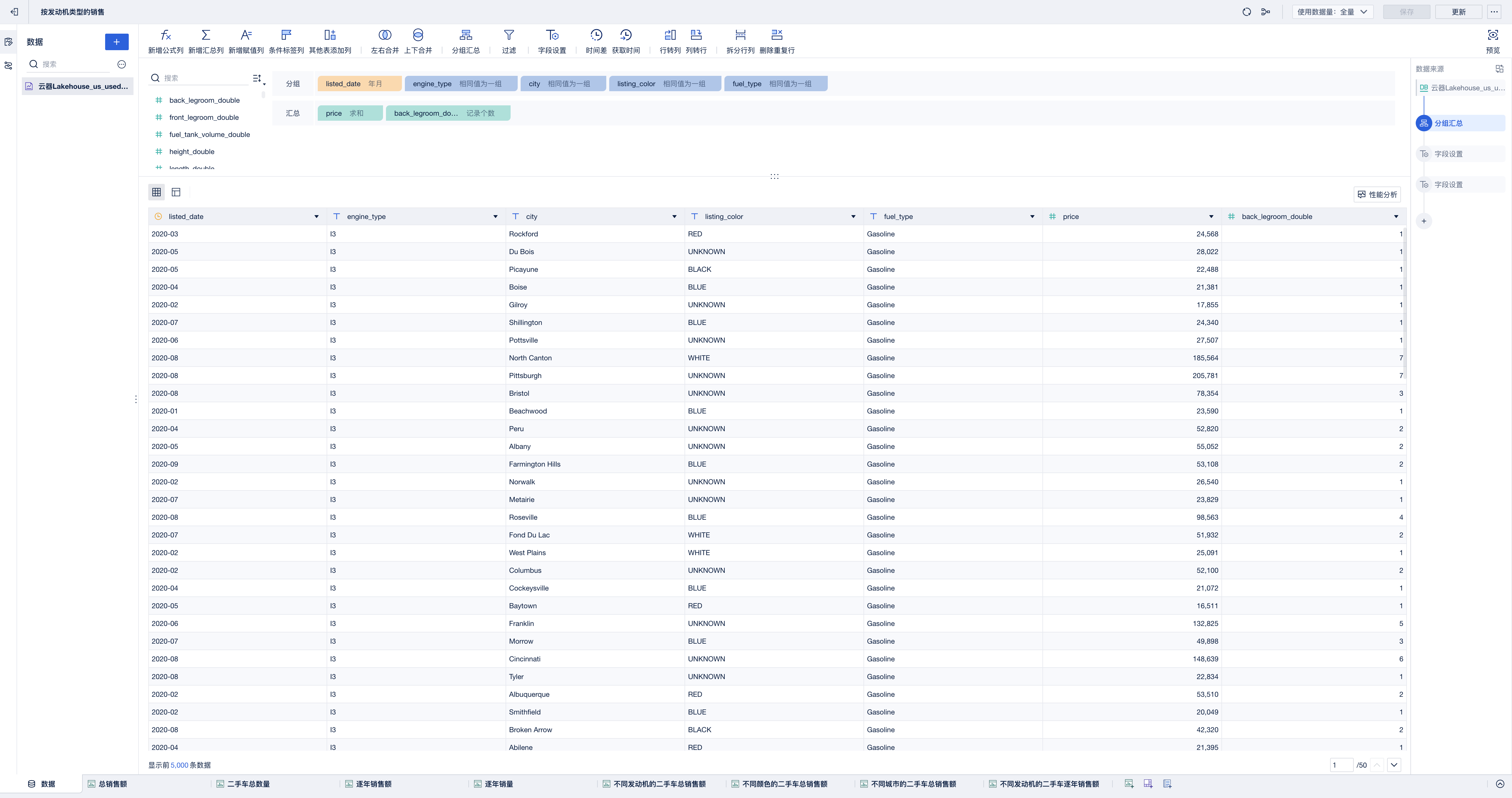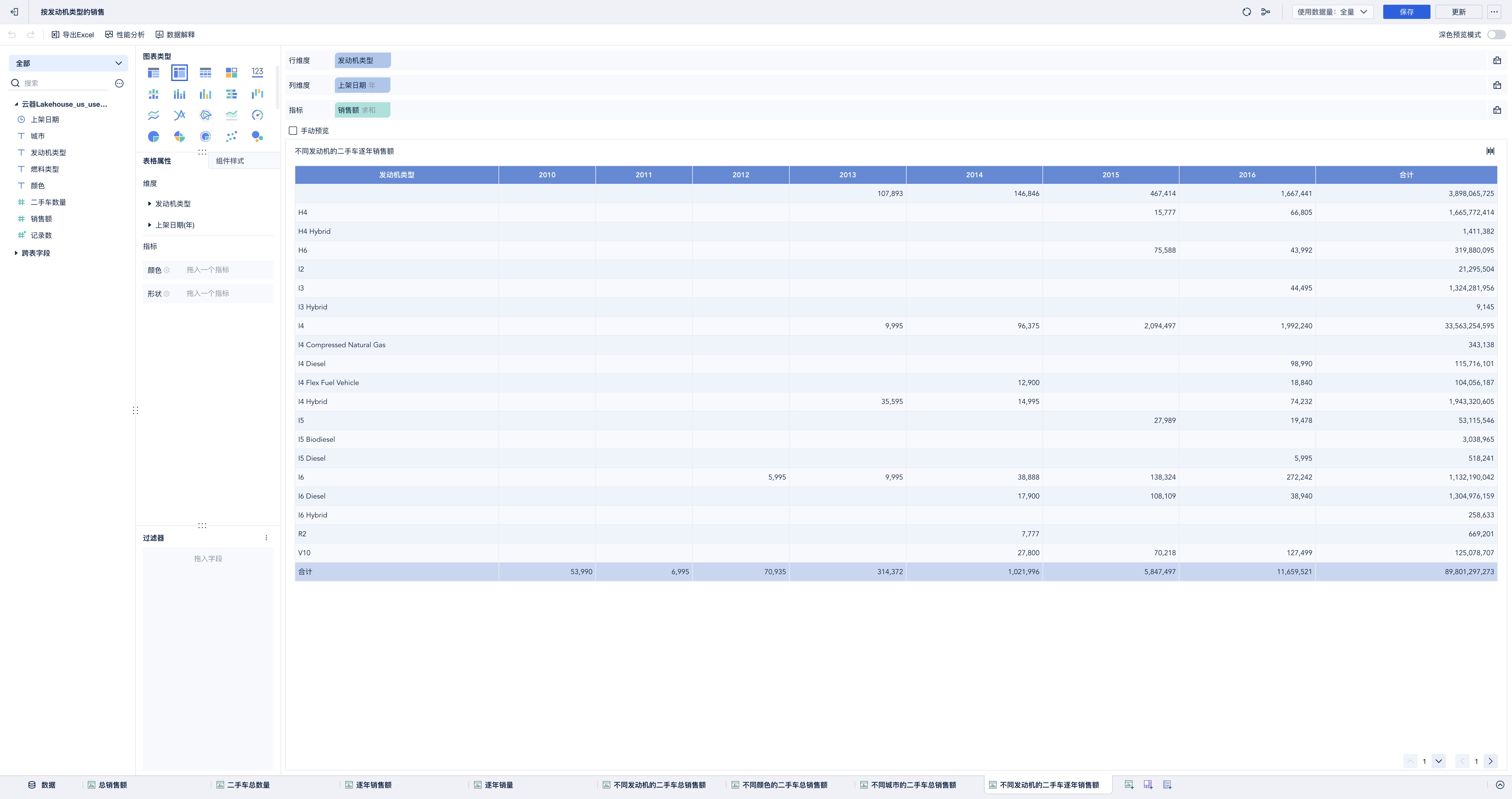 基于数据视图的可视化组件-交叉表,分析不同发动机的二手车逐年销售额
