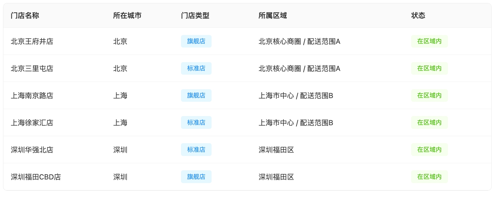 - 地理围栏分析:成功判断了所有门店的区域归属,100%的门店都在其对应的服务区域内: