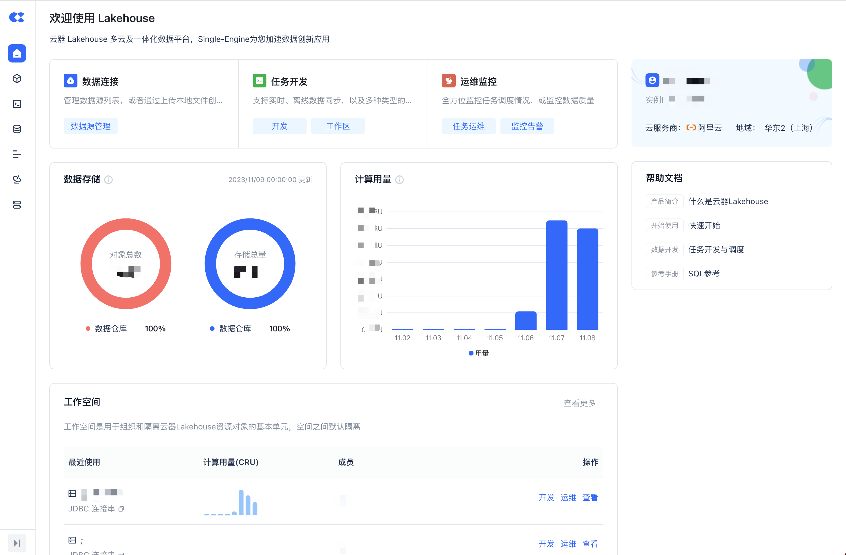 服务实例首页是您了解云器Lakehouse核心产品能力和快速访问工作空间的入口。操作步骤如下: