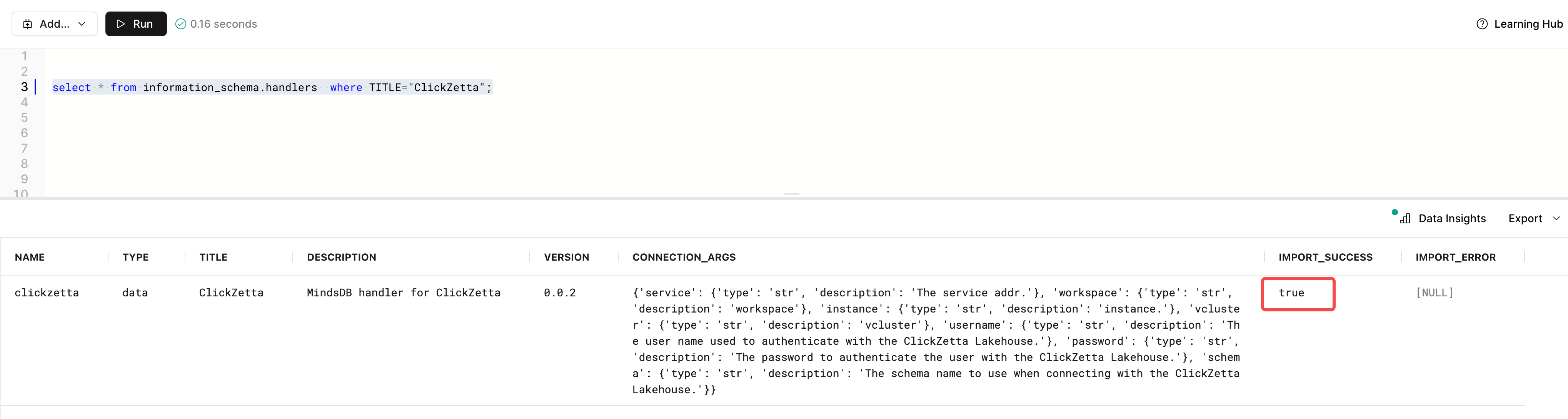 访问MindsDB Studio 检查云器Lakehouse Handler状态