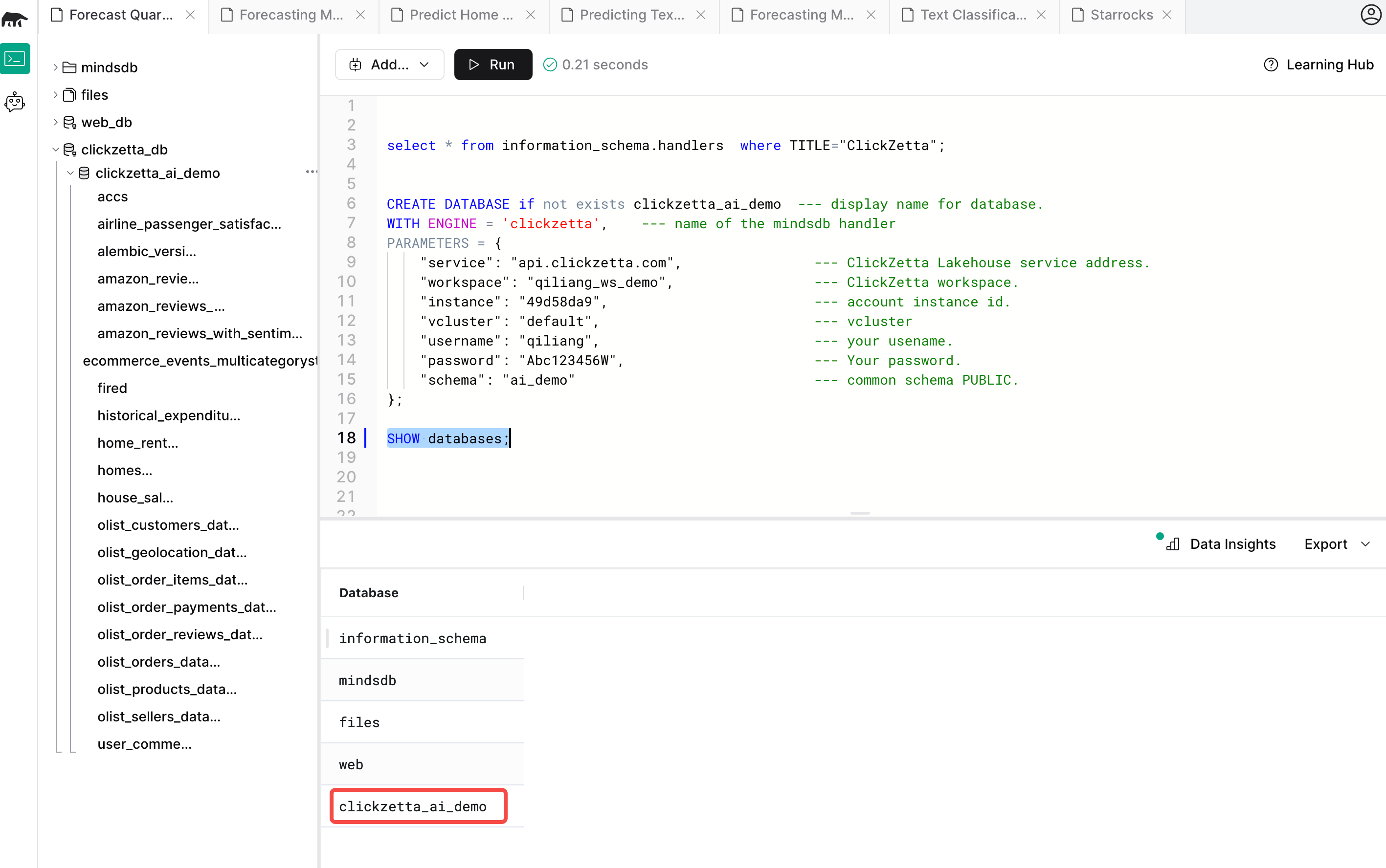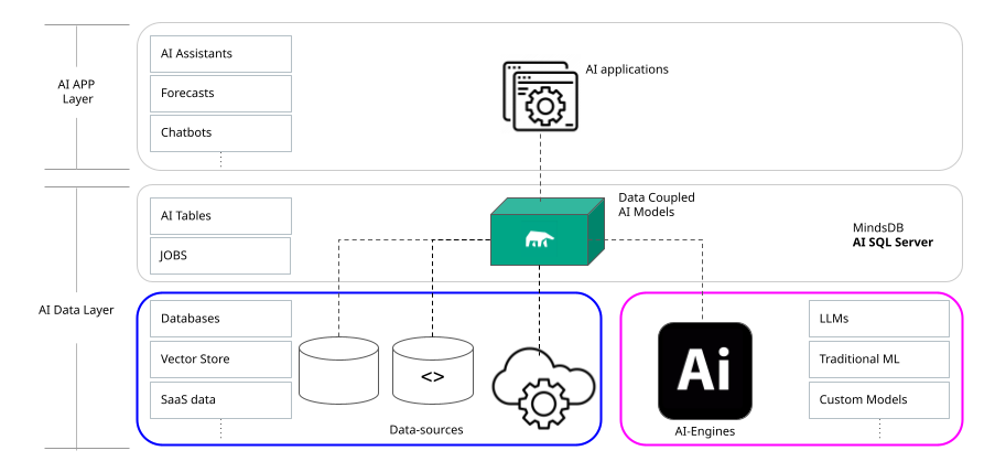 MindsDB 通过 AI 构建模块增强了 SQL,以便开发人员创建需要与实时数据耦合的 AI 应用程序。MindsDB 的创新之一是能够将 AI(模型、代理、知识库)视为虚拟表,您可以使用任何AI 引擎从云器Lakehouse数据源中进行 SELECT FROM、JOIN和FINE-TUNE。