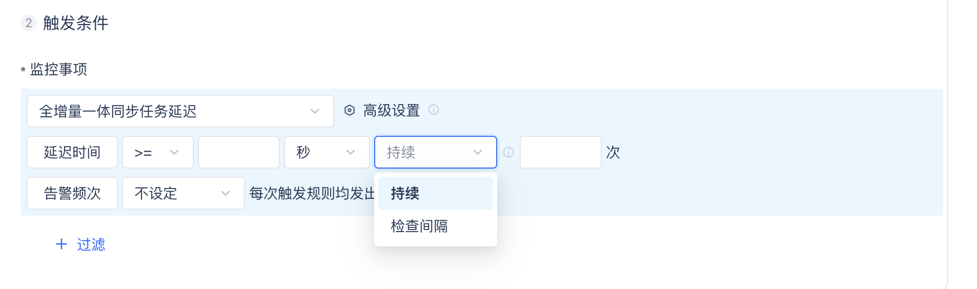 指标监控配置:用户可以定义计算方式和阈值,并选择触发方式。例如,配置全增量一体同步任务延迟指标,延迟时间大于等于50秒,持续3个数据点,告警频次限制为30分钟发送一次。