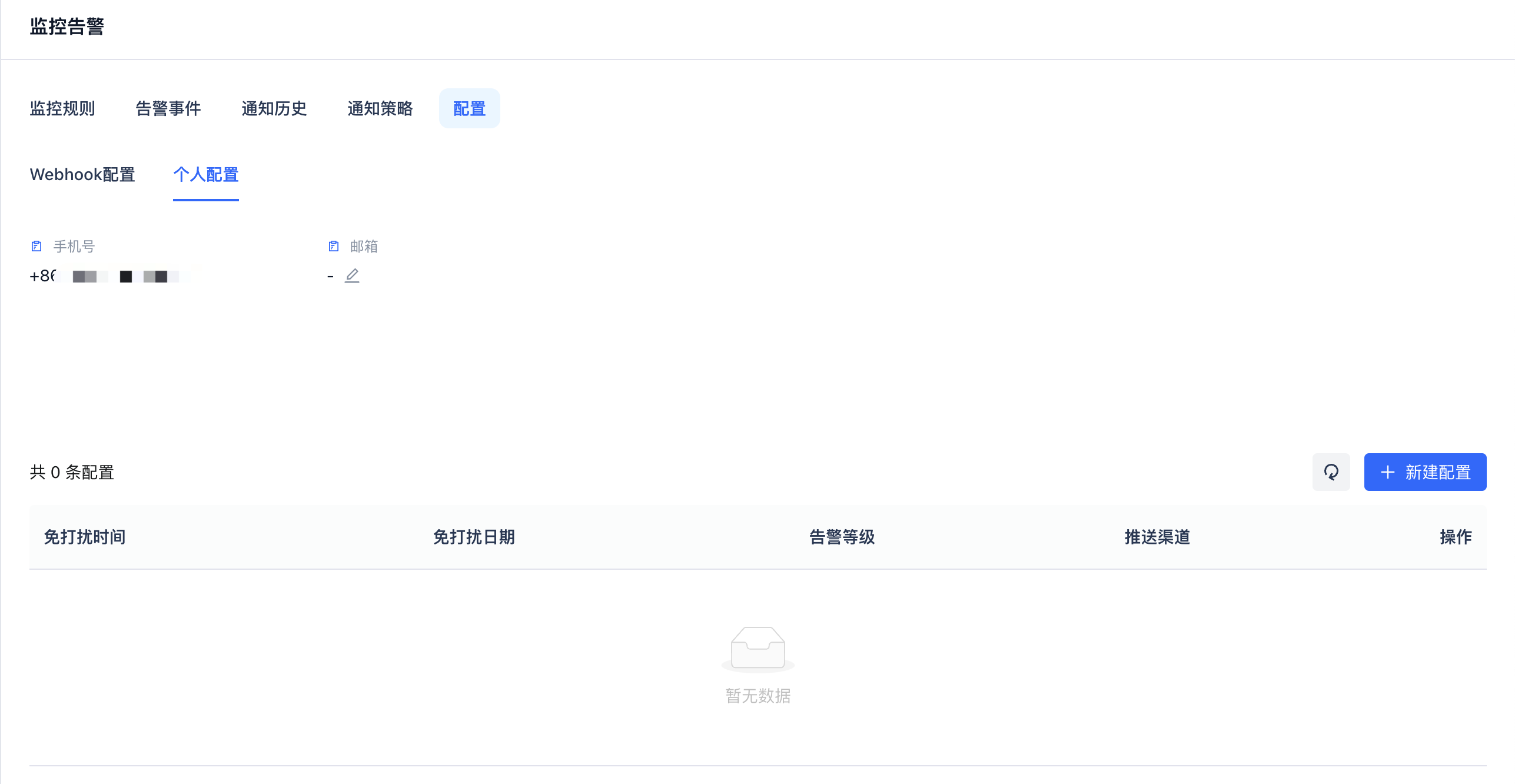 用户可以在个人配置中修改接收告警的手机号和邮箱地址,并设置免打扰时段。