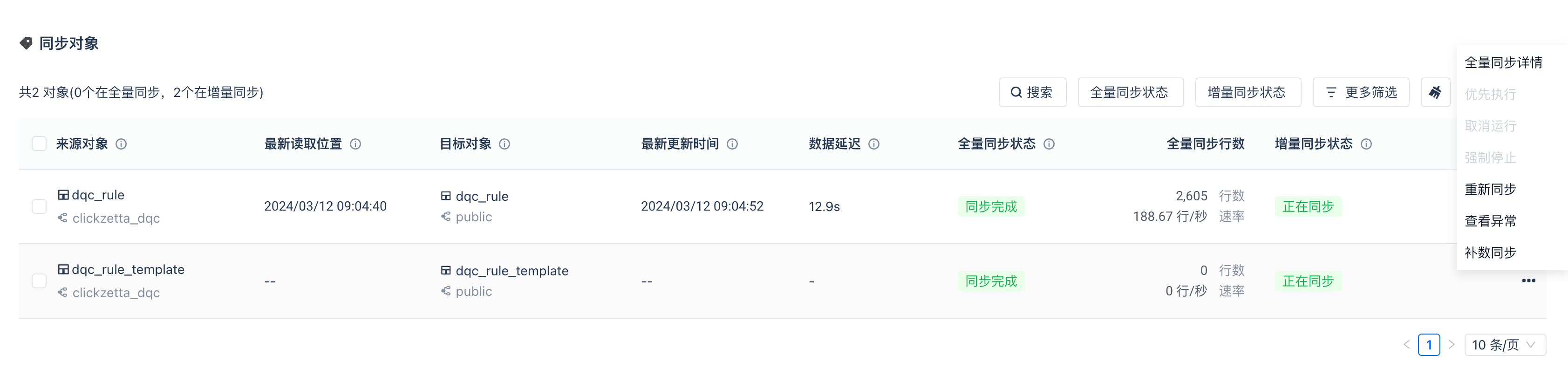 在同步对象区域,可以查看单表的同步终态和进行对应的运维操作。