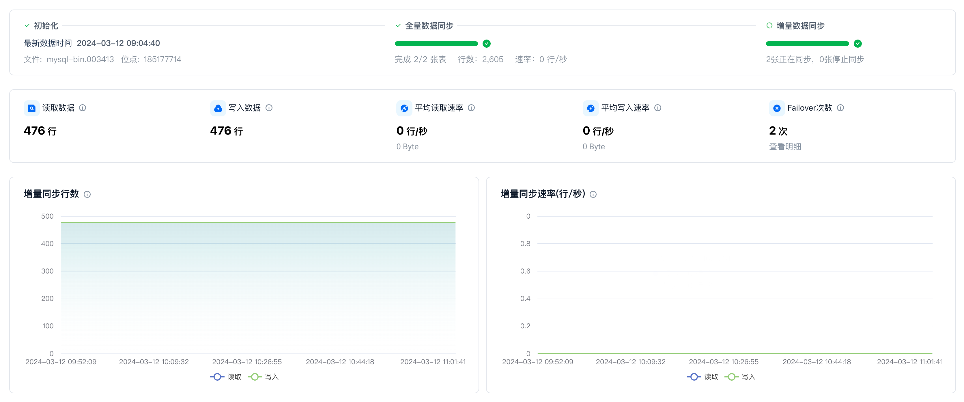 在指标监控区域,可以查看全量同步和增量同步的关键监控指标。