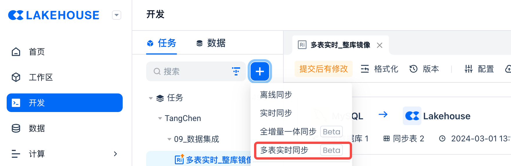 在任务开发界面,点击新建操作,选择“多表实时同步”任务类型。