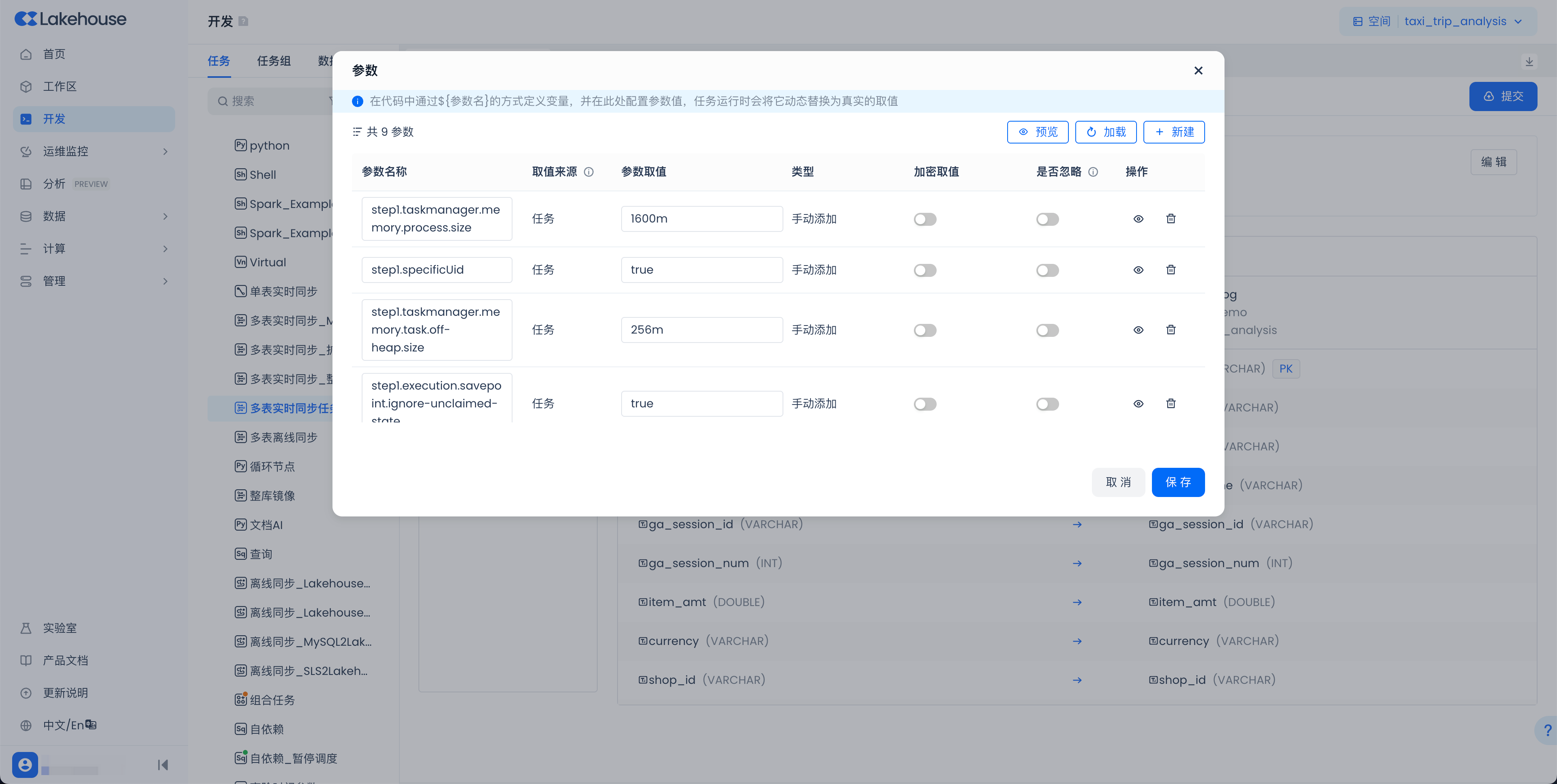 在多表实时同步任务的「参数」区域,可以设定一些高阶参数来控制同步任务的资源消耗等。