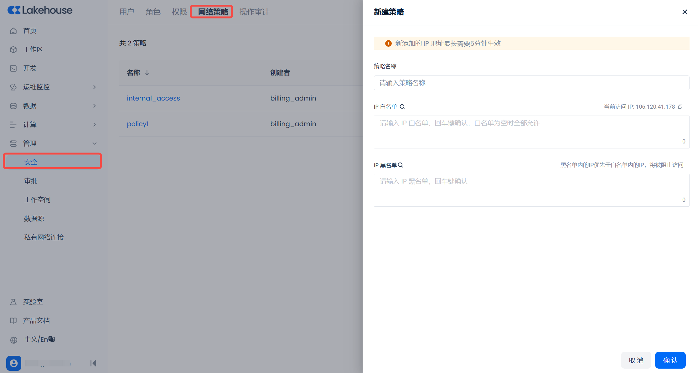 (可立即生效或可被再次激活/使用,视产品而定)。 - 当前访问Lakehouse所使用的IP也可被写入白名单/黑名单内。如果将当前使用的IP加入黑名单,将导致策略生效后,对当前服务实例的访问立即被阻止。请谨慎操作。