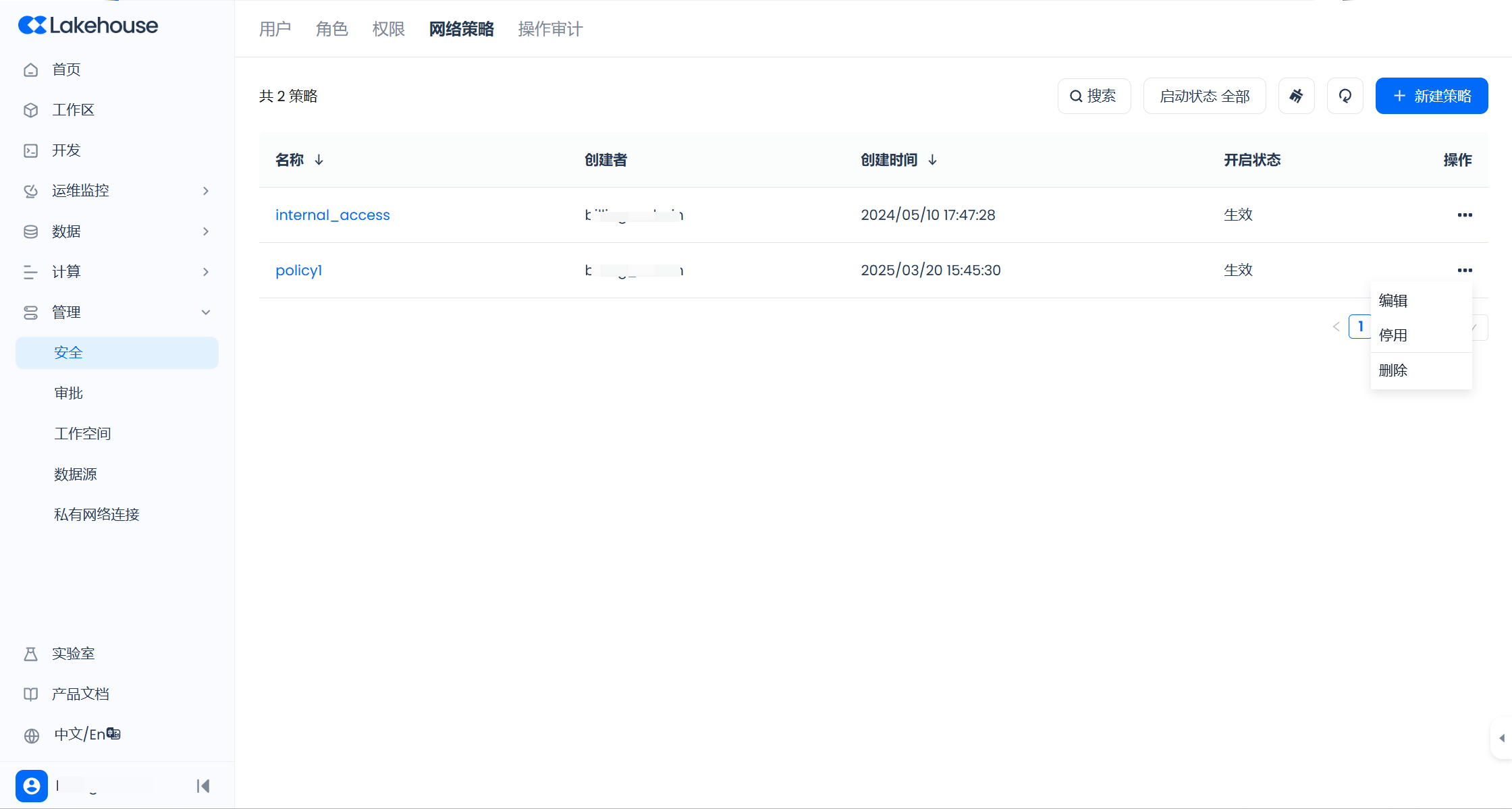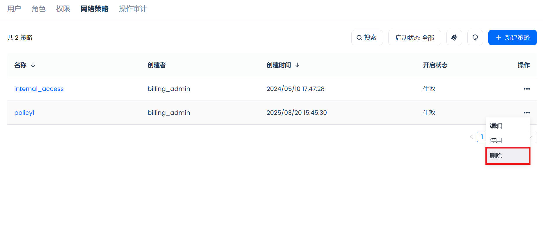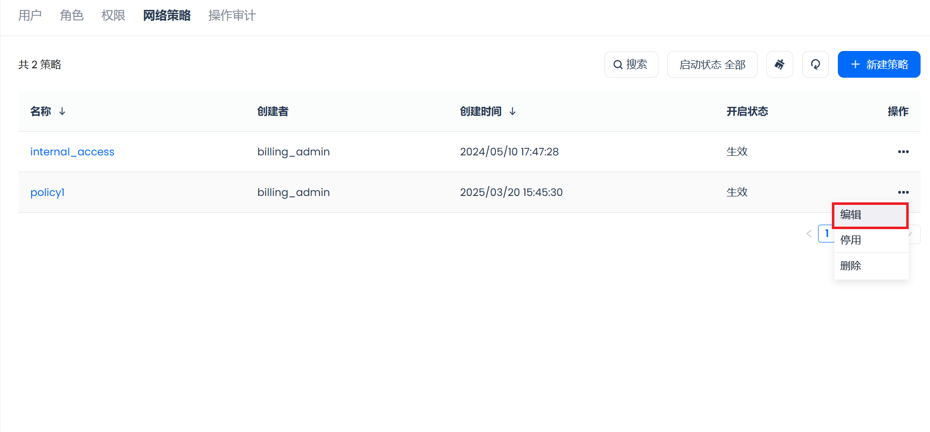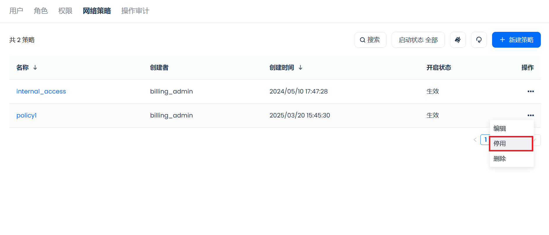 在“管理”-“安全”-“网络策略”功能中,在需要修改的网络策略右侧的“操作”栏中点击“停用”/“启用”按钮,即可切换网络策略的状态。