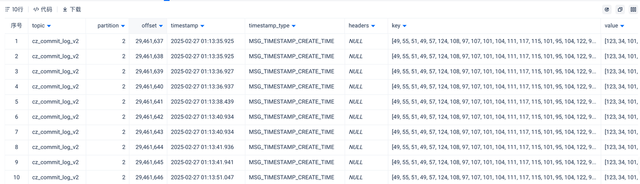 kafka 数据中的 key 和 value 都是 binary 类型。通常我们更关心的是 value 的内容。如果其中本来存放就是字符串,可以在 select 的时候 cast 成 string 来快速探查其中内容。