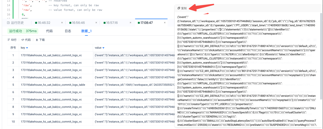 点击「复制」获取样例数据并探查,可见 value 大体是个 JSON,但是 JSON 中有些 string field 还是个完整的 JSON,看起来还不止一层,结构略复杂: