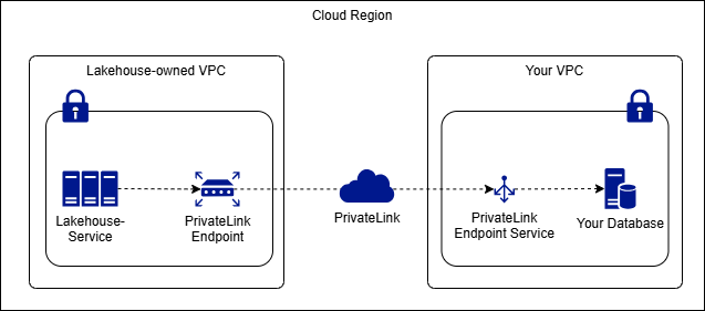 例如: 某金融领域公司选择在 Lakehouse 做统一数据存储与分析,但其核心业务数据库存放在私有 VPC 内部,且有严格的安全策略,禁止对公网暴露数据库端口。Lakehouse 需要通过实时集成读取数据,用于后续分析、风控模型训练等。
