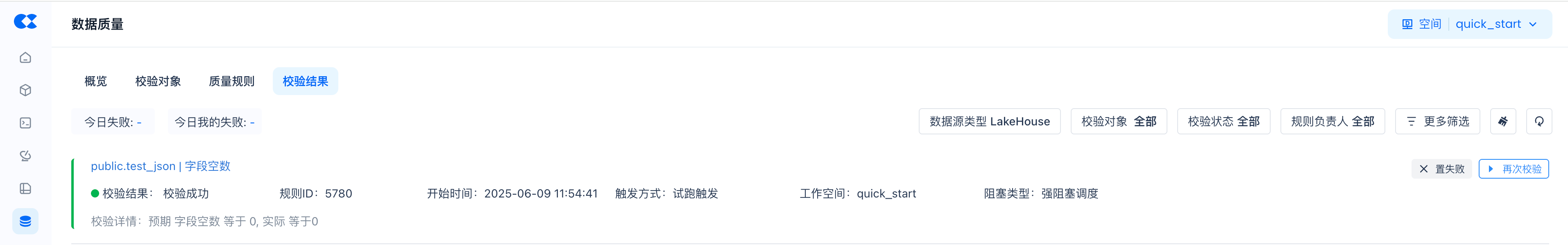 可以点击“试跑”按钮来测试质量规则的配合和校验情况,在“校验结果”Tab可以查看具体结果,如下图所示,质量规则被触发运行、校验结果和预期一致、一切正常,校验符合预期。