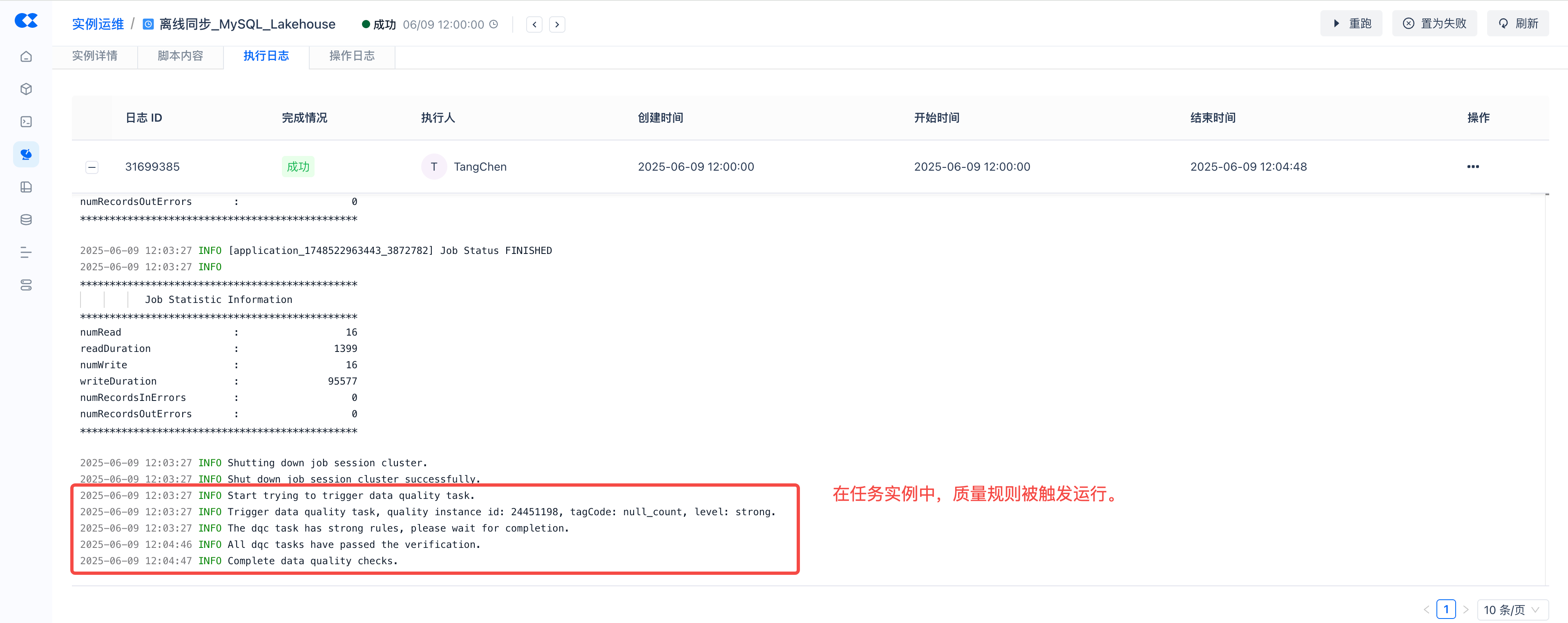 在「任务运维」里面,通过周期任务实例运行的日志中,可以查看对质量规则的触发运行情况。