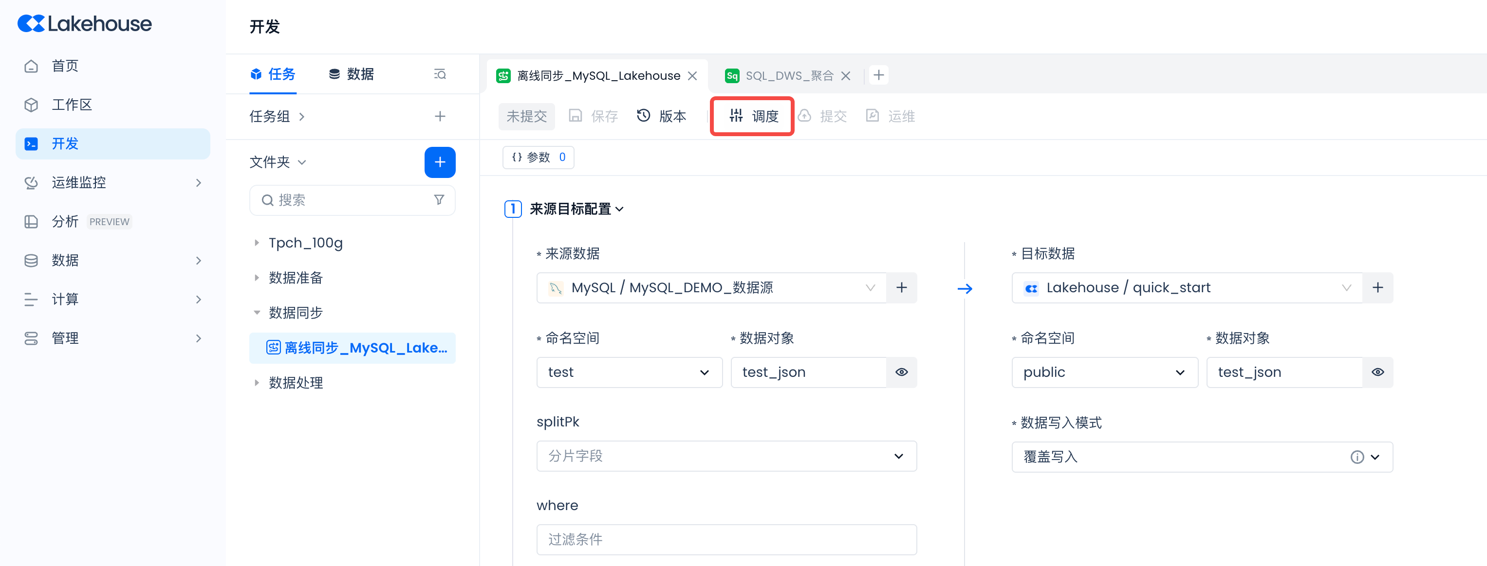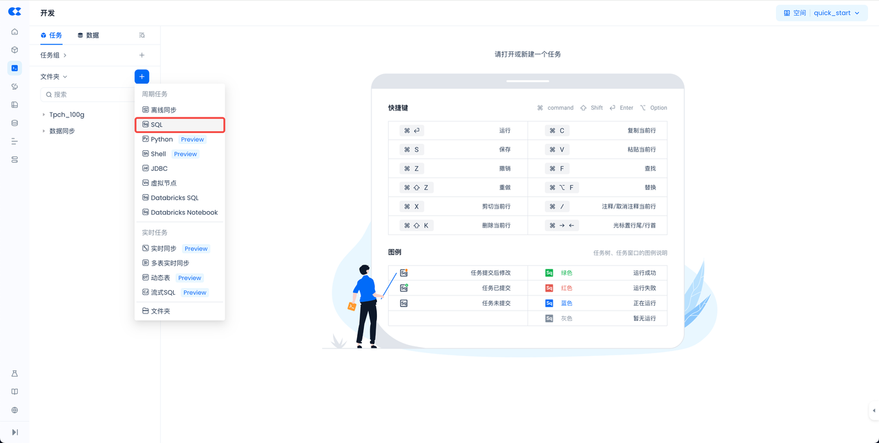 在 入门指南:如何快速创建同步任务来导入数据 中,我们已经创建了一个数据同步任务。本文档的示意,会再继续创建出一个SQL处理任务,并让其依赖上数据同步任务,构建出一个ETL流程,并配置调度定时来定期运行。
