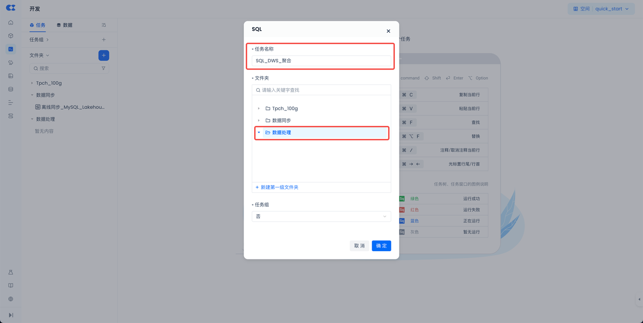 在创建任务的弹框中,将任务命名为“SQL_DWS_聚合”,并单独创建出一个名为“数据处理”的文件夹。