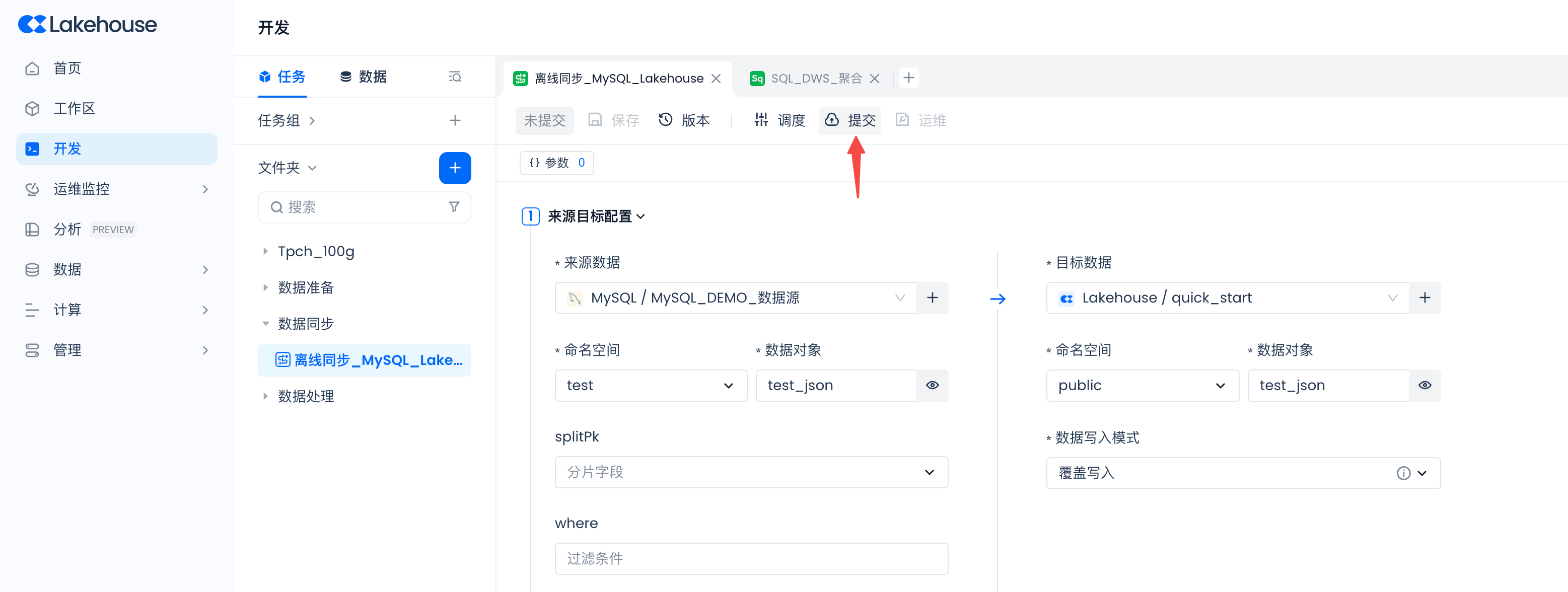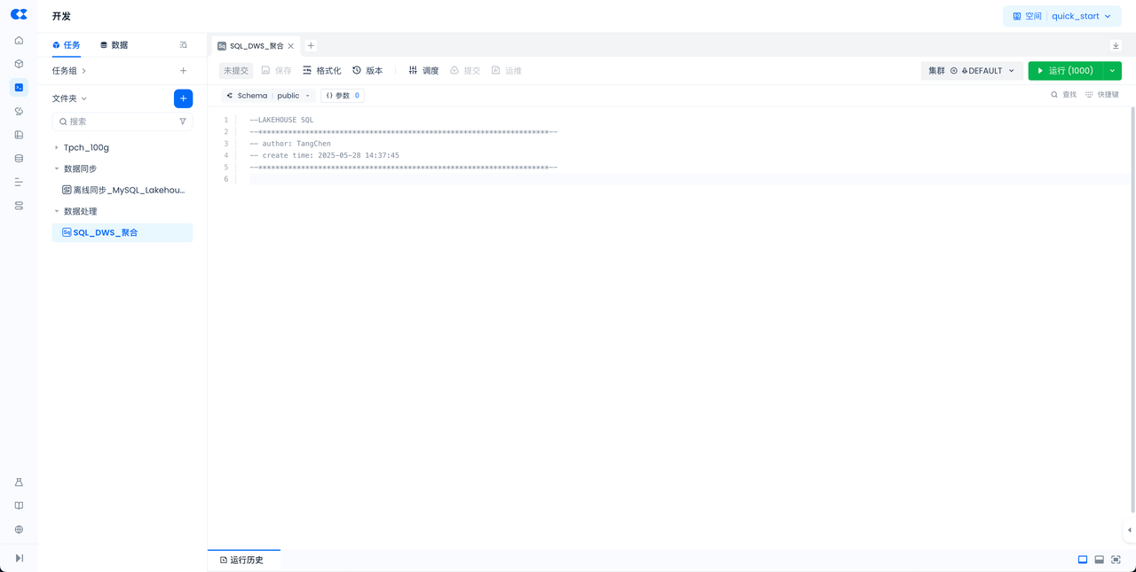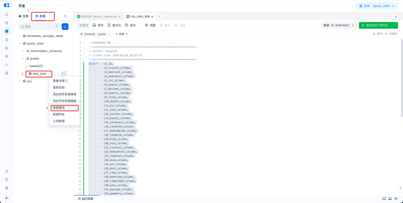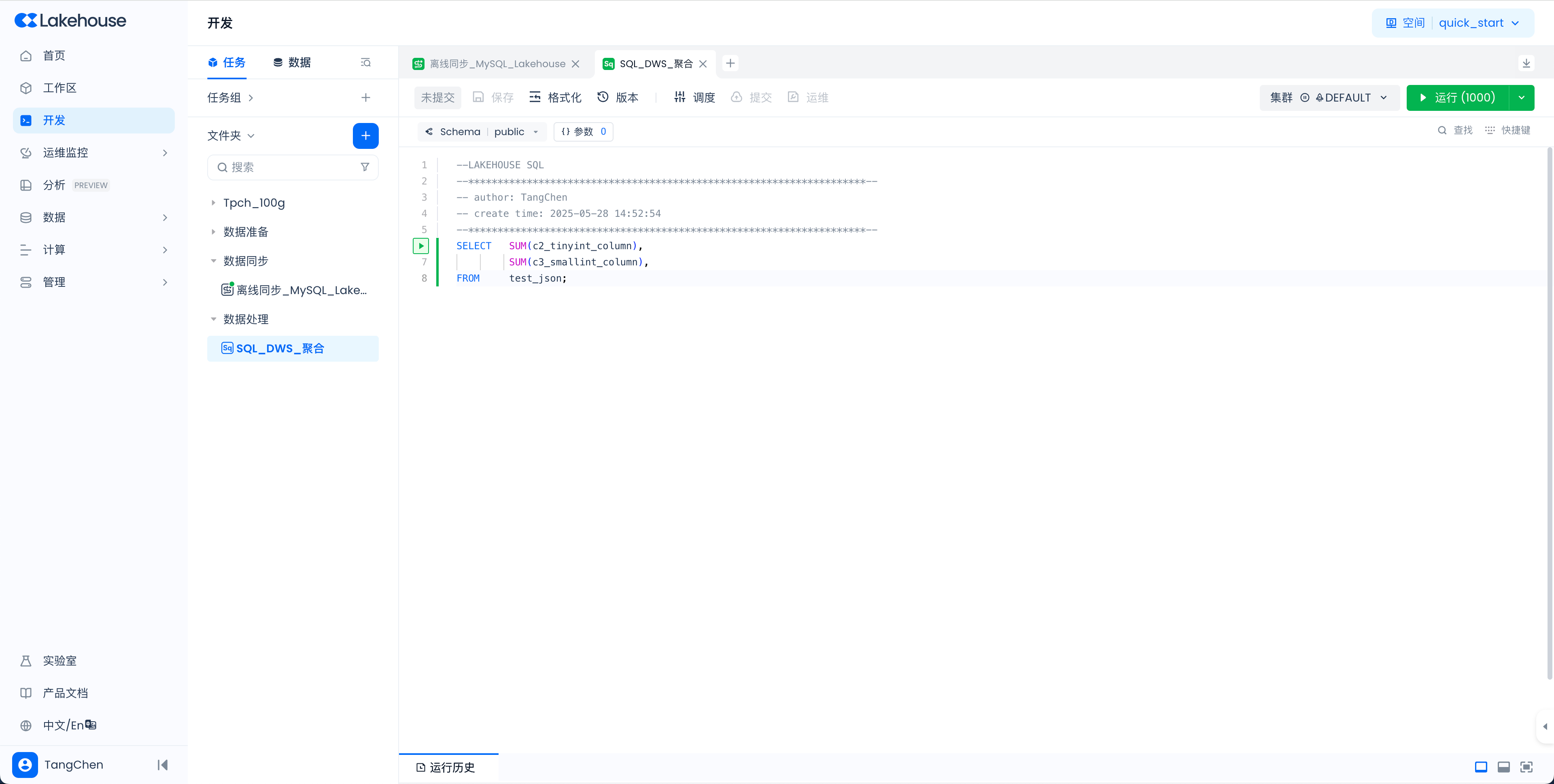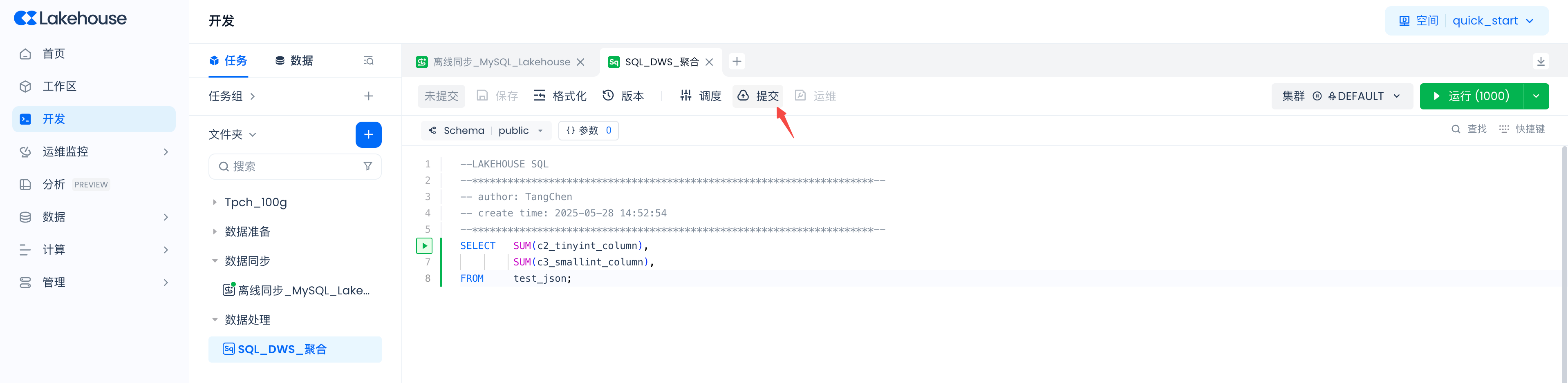 前面通过数据同步任务,已经把MySQL的数据同步到Lakehouse的test_json表中。在SQL任务中,基于这张表中数据进行聚合处理,比如把表中的c2_tinyint_column、c3_smallint_column两个字段分别求和。导航到“数据”Tab,定位到目标表 test_json,然后在操作栏里,点击“数据查询”,可以自动把SELECT的代码模板插入到编辑器中,如下图所示,可以帮助编写代码提效。