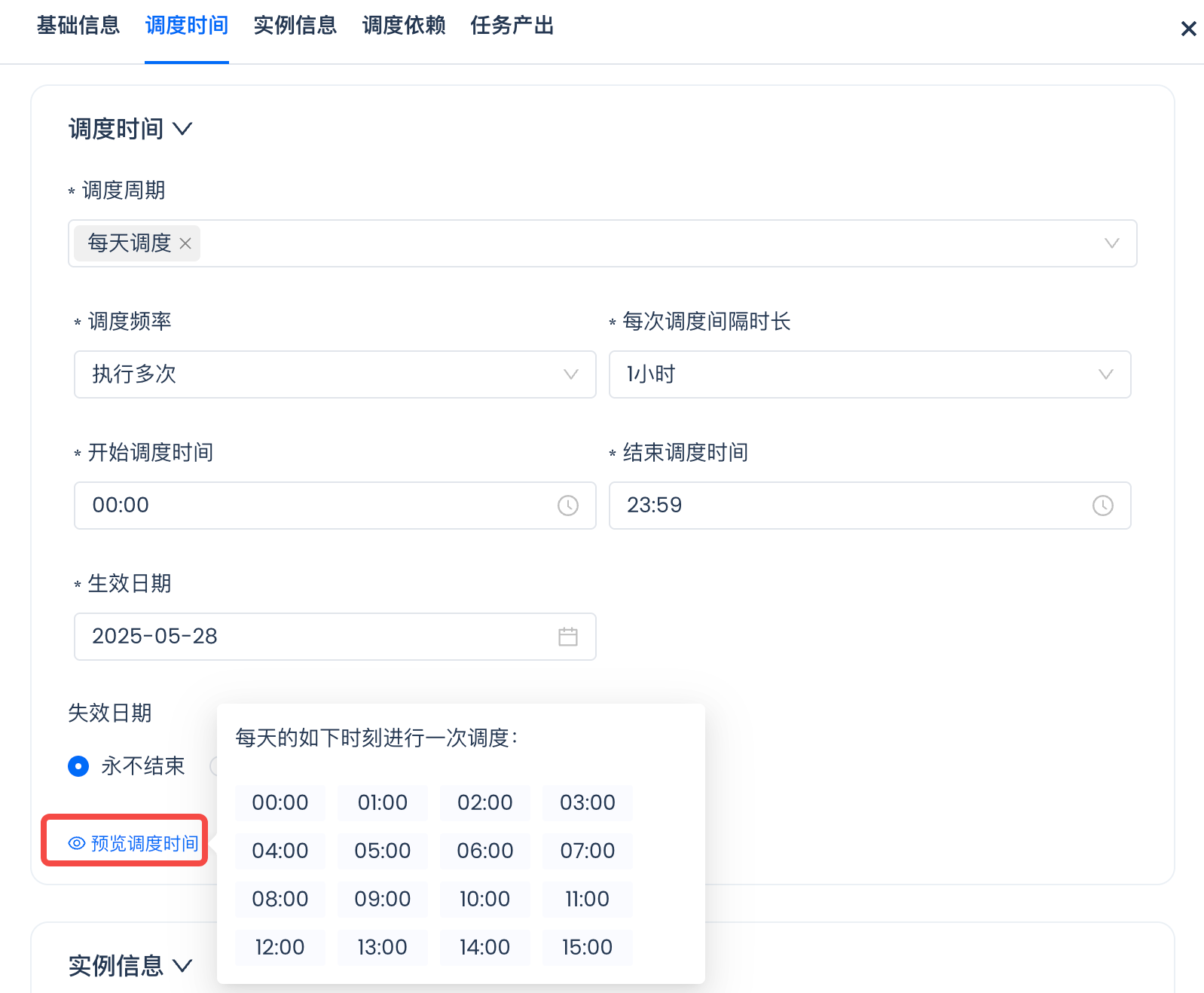 配置调度时间:配置成每天调度、执行多次、每一个小时调度一次,如下图所示。通过“预览调度时间”可以查看基于配置对应的具体定时时间。