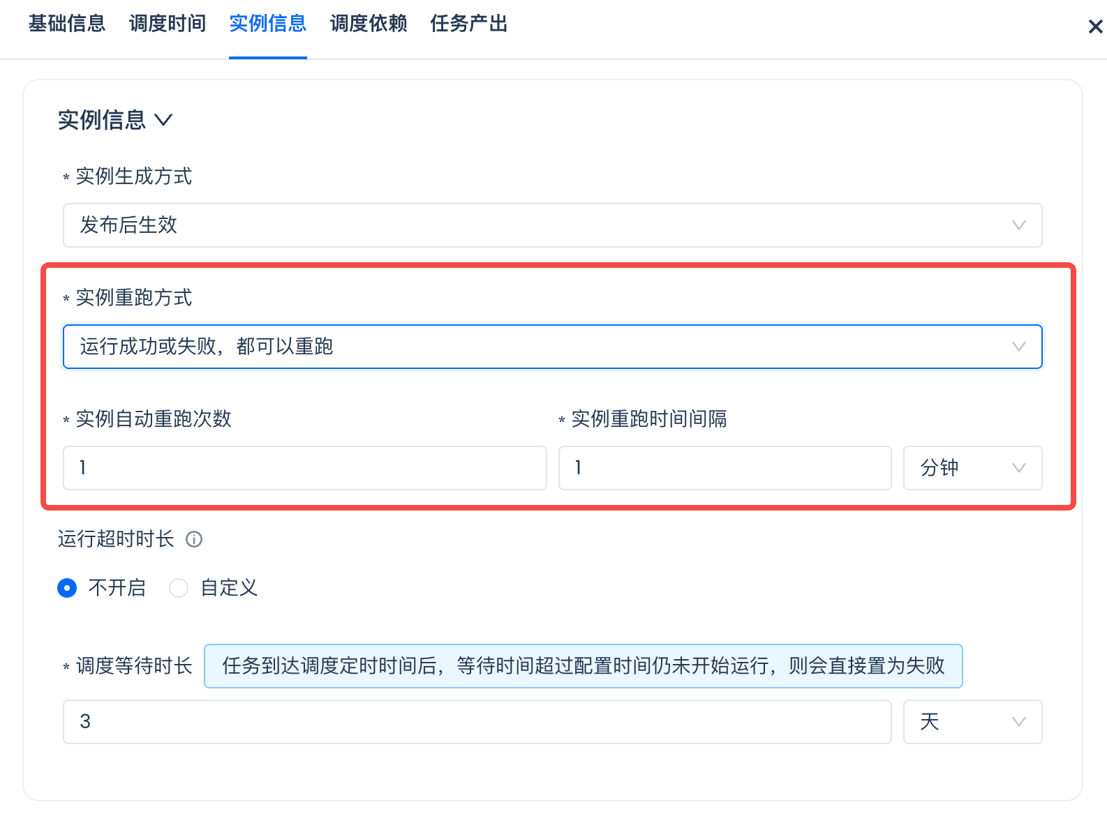 配置实例信息:这里主要需要配置“实例重跑方式”,由于本任务不存在重跑之后产生数据不幂等的问题、可以重跑,选择“运行成功或者失败,都可以重跑”,其它属性使用默认值即可。