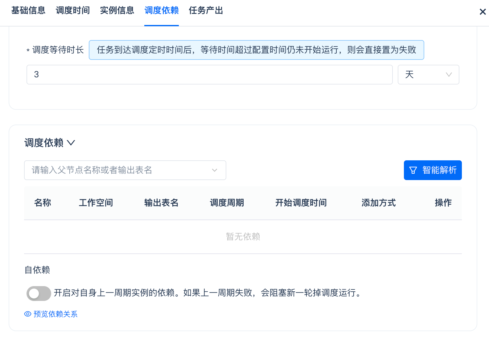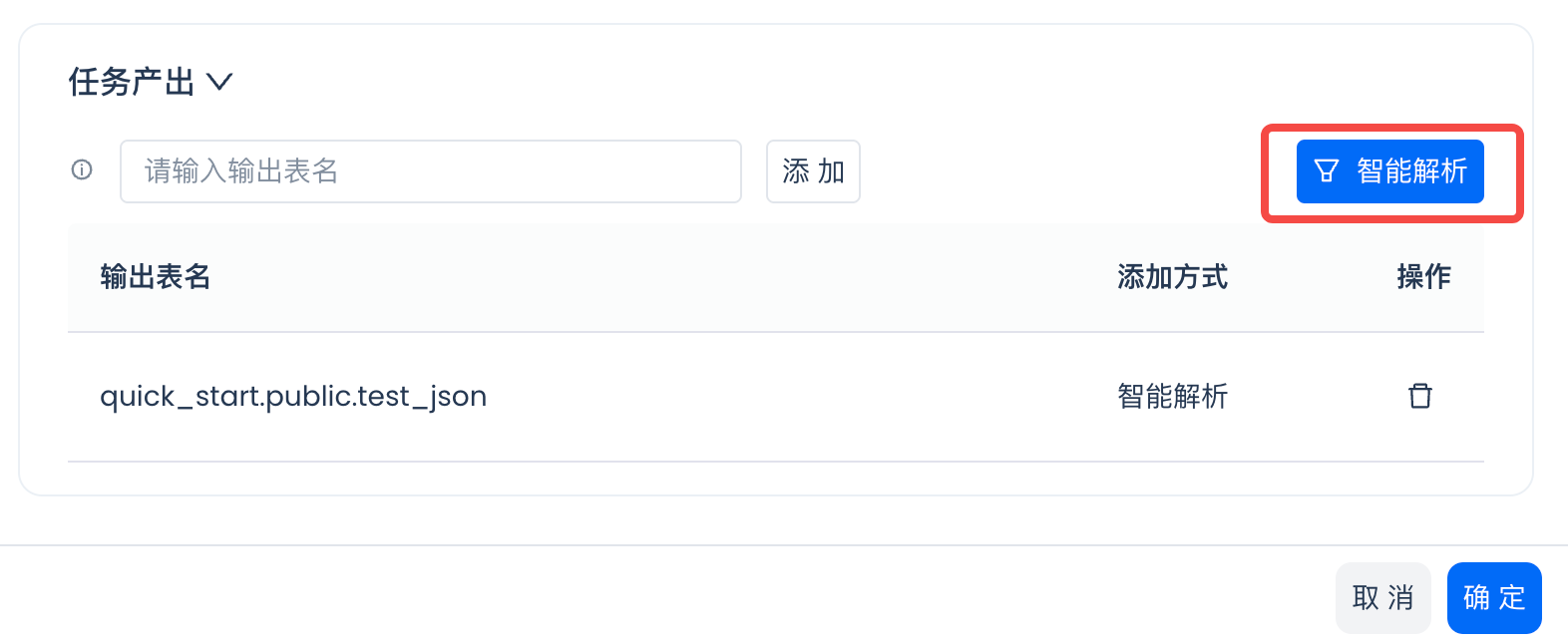 配置任务产出:任务产出描述本任务写入的是哪张表,用于下游任务消费这张表时,能智能识别到对应的任务。点击“智能解析”按钮,会通过任务配置自动解析出当前任务的产出表并回填配置。