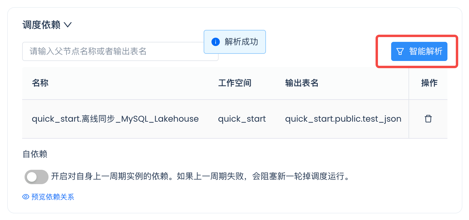 - 请特别注意需要配置上SQL任务对同步任务的依赖关系。点击页面上“智能解析”按钮,会自动识别到SQL任务依赖的同步任务、自动回填;也可以手动添加。