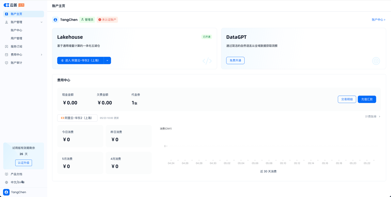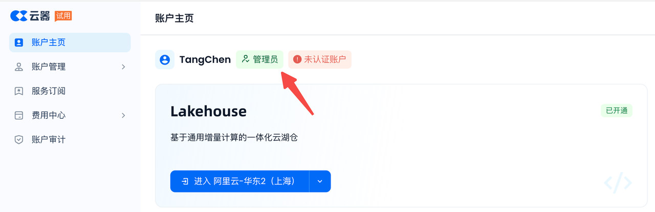 登录产品后,您默认会自动进入到“管理中心”的“账户主页”页面,如下图所示: