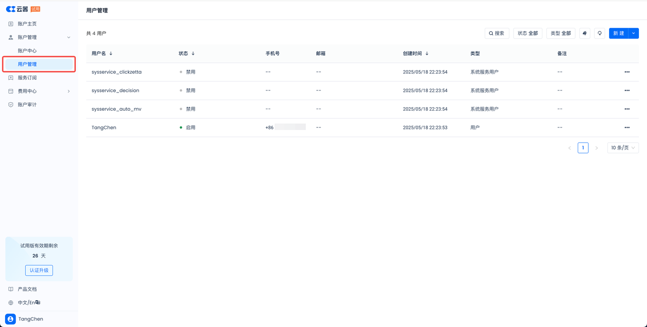 通过管理中心的左侧导航的 账户管理 > 用户管理,进入到“用户管理”页面,如下图所示: