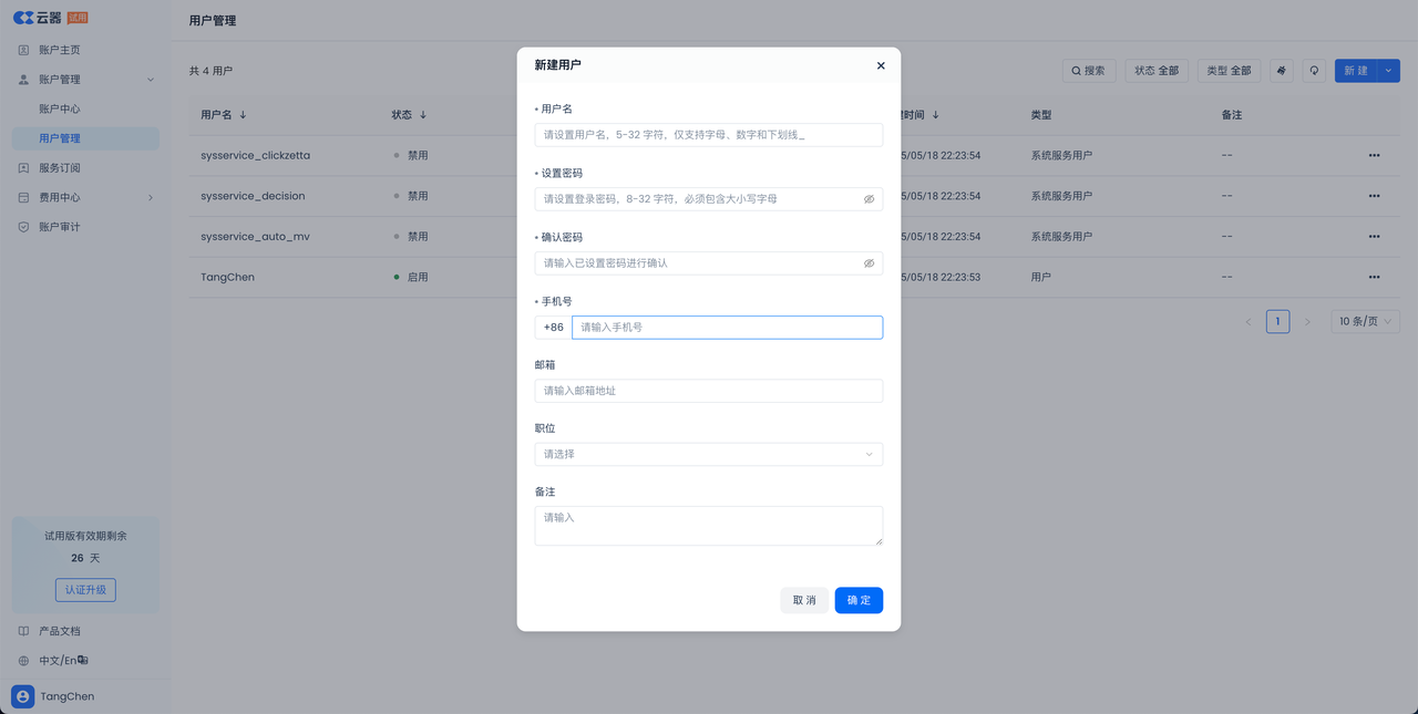 在弹框中按照页面指引填写必填信息,即可创建出一个新的账号。请注意两个事项: