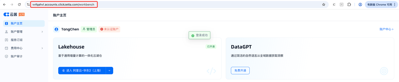 账户登录地址,其格式为:<账户名>.accounts.clickzetta.com。也可以通过直接复制下图所示的浏览器中地址、发送给该用户即可。