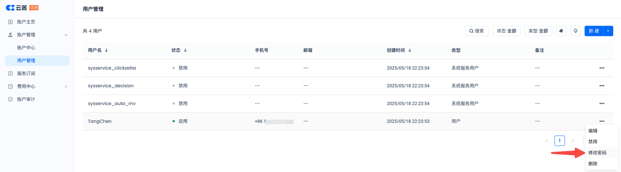 获得用户名和密码的人员,登录到产品后,如果想修改初始密码,通过左侧账户管理 ->用户管理 导航进入到用户管理页面,找到对应账号后,通过操作菜单中的“修改密码”可对密码进行修改。