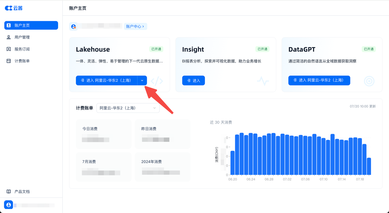 在管控中心的“账户主页”中,点击开通的服务实例,可进入服务实例的首页。