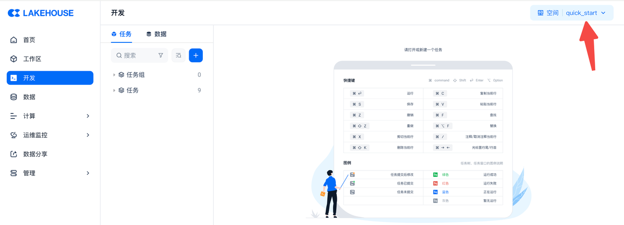 服务实例开通后,系统默认会创建一个名为“quick_start”的工作空间。您可以直接使用此工作空间进行任务开发等工作。