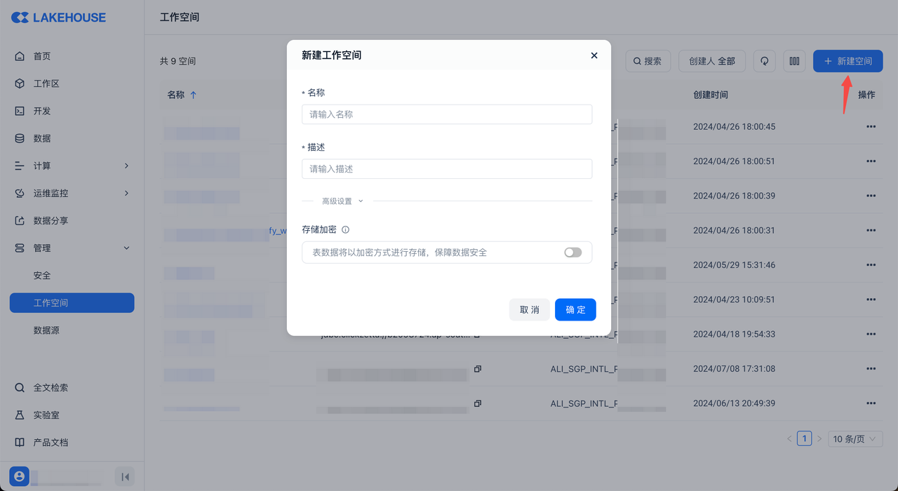 进入“管理-工作空间”菜单,在工作空间管理页面中点击“新建空间”,填写所需信息后进行创建。