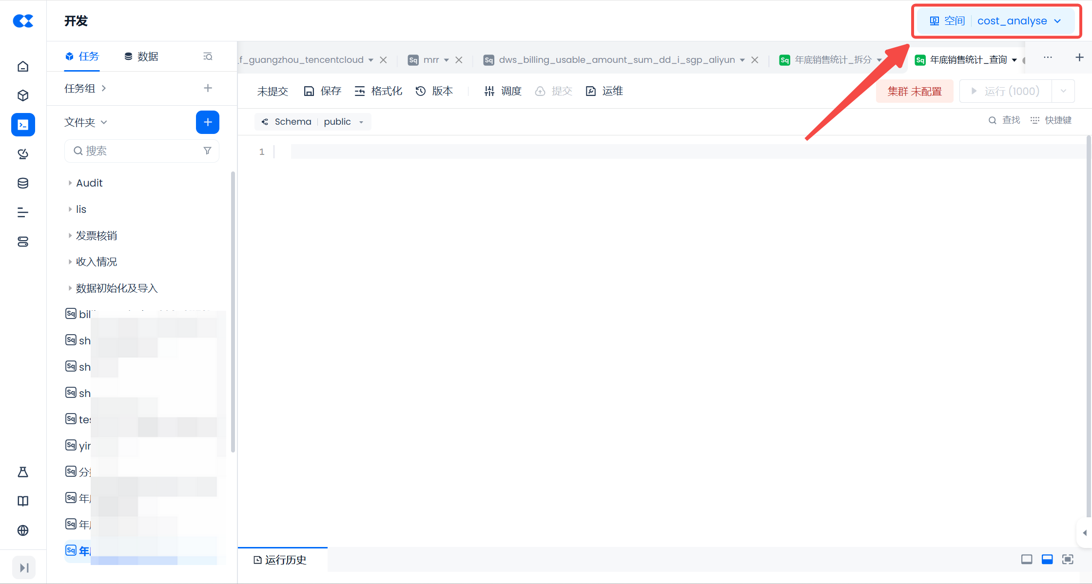 使用多个工作空间时,可在“开发”、“计算”、“运维监控”等功能页面中,通过右上角的工作空间按钮,切换不同工作空间环境进行使用。