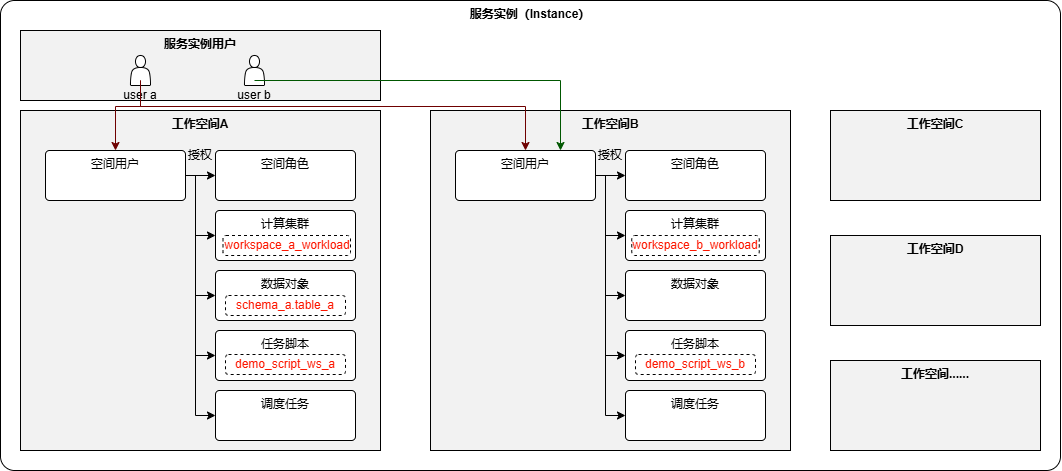 如上图所示,一个Lakehouse服务实例内可以创建多个工作空间。一个服务实例用户可以被同时添加进入多个工作空间内并被授予该工作空间内对象的权限。