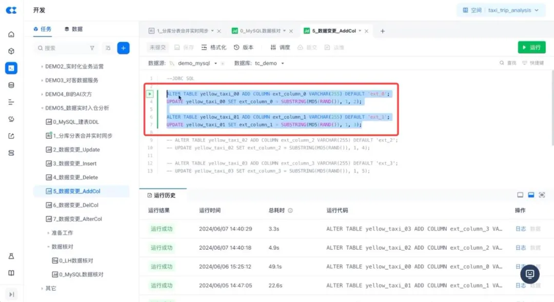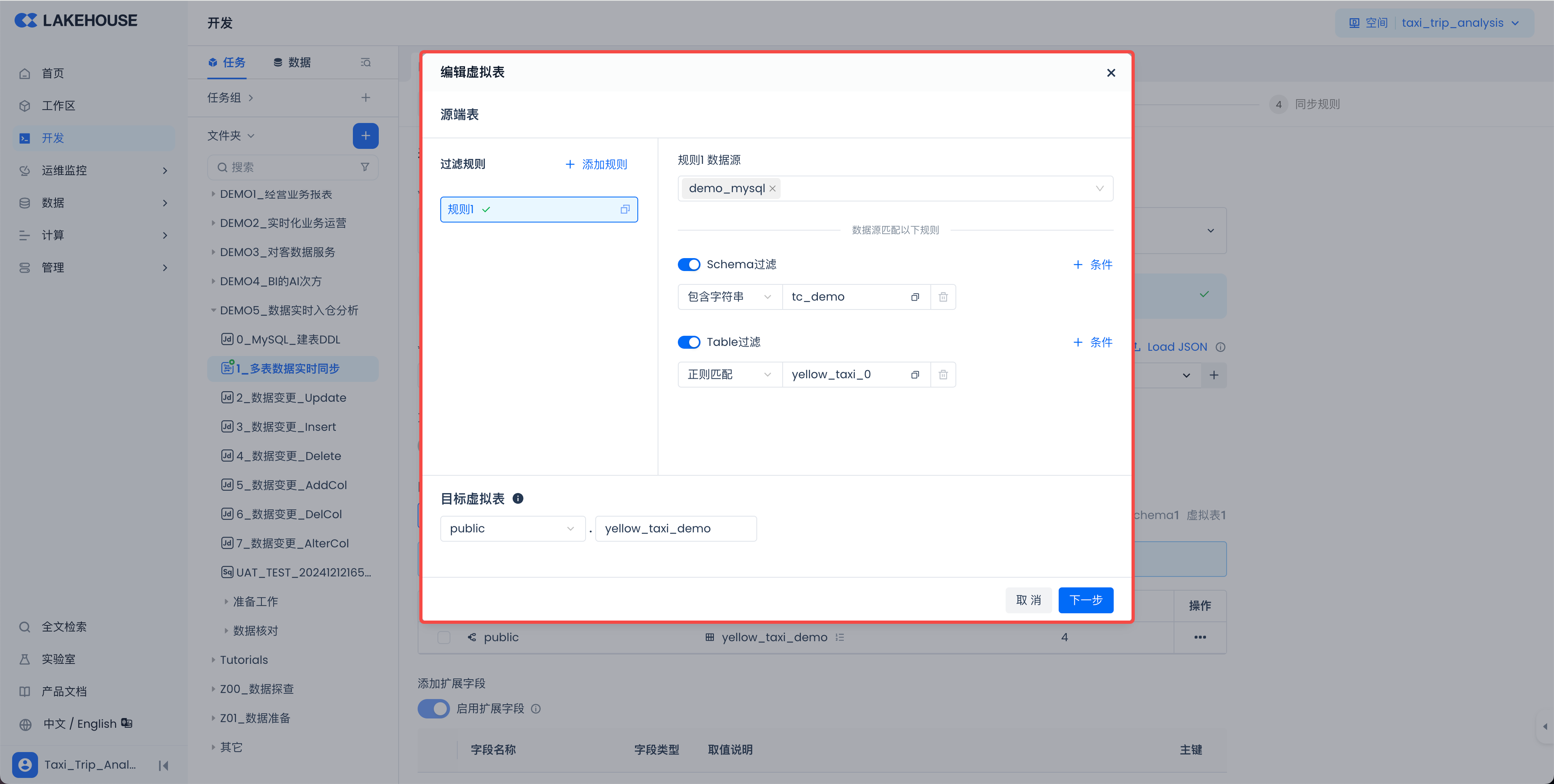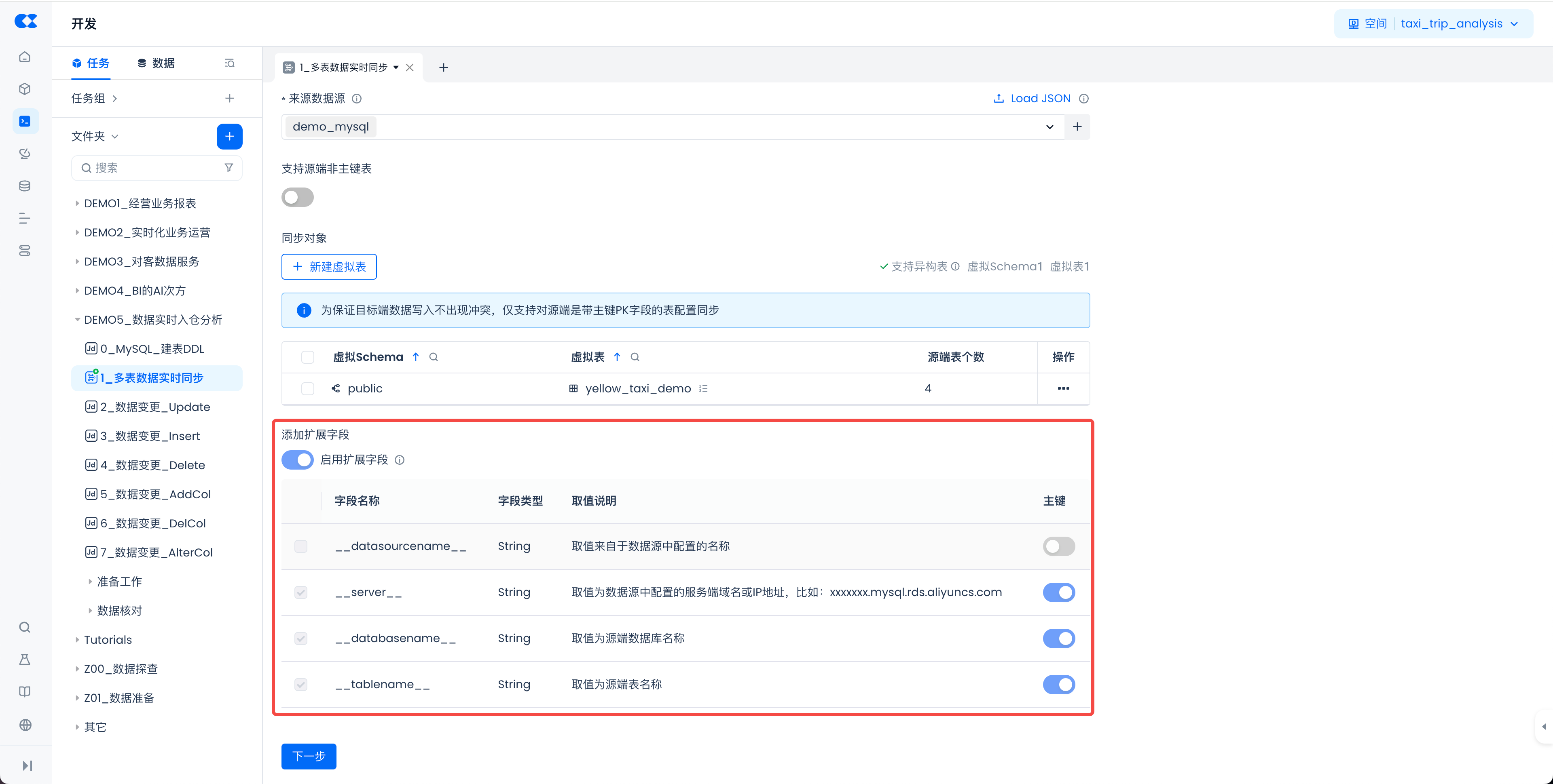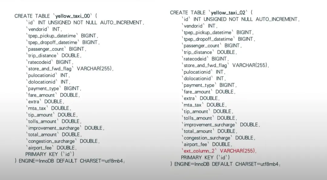 本演示以常见的 SaaS 服务模式为例,在多租模式下,数据库采取分库分表的结构,数据存在不同的分表;某些租户的信息会存在同一张分表内,且不同分表中包含特定租户的定制扩展字段,即源端是基本相同的四张分表,但部分表的字段存在细微差异,如下图所示,yellow_taxi_02 表,相比yellow_taxi_00表,多出了一个扩展字段 ext_columm_2 。
