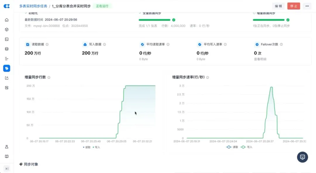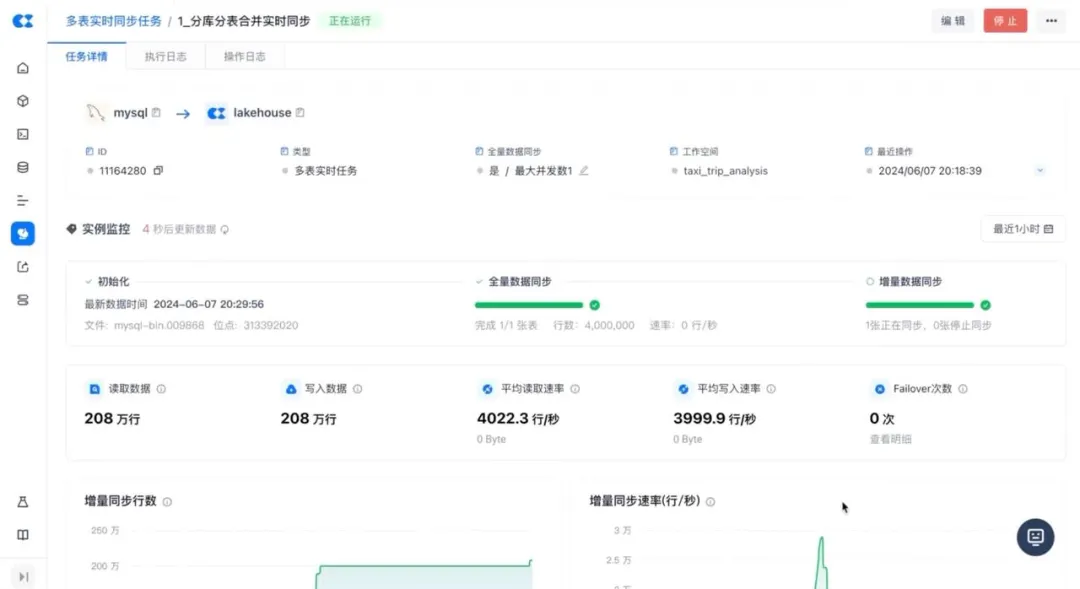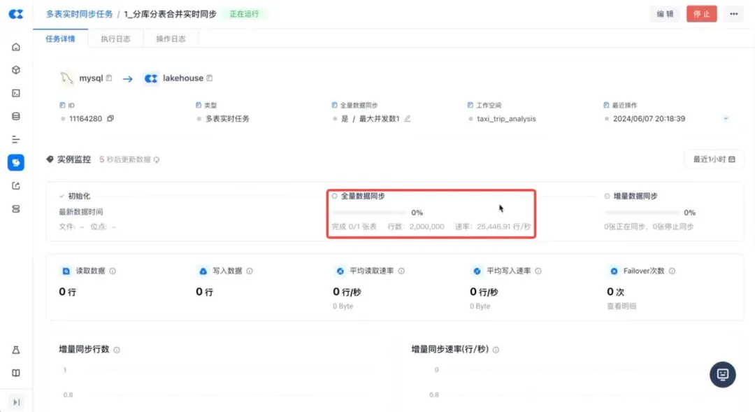 任务启动后,在运维界面中,可以看到任务会进入全量同步阶段,数据已经写入 200 万行,速率在 25, 000+ 行/秒。