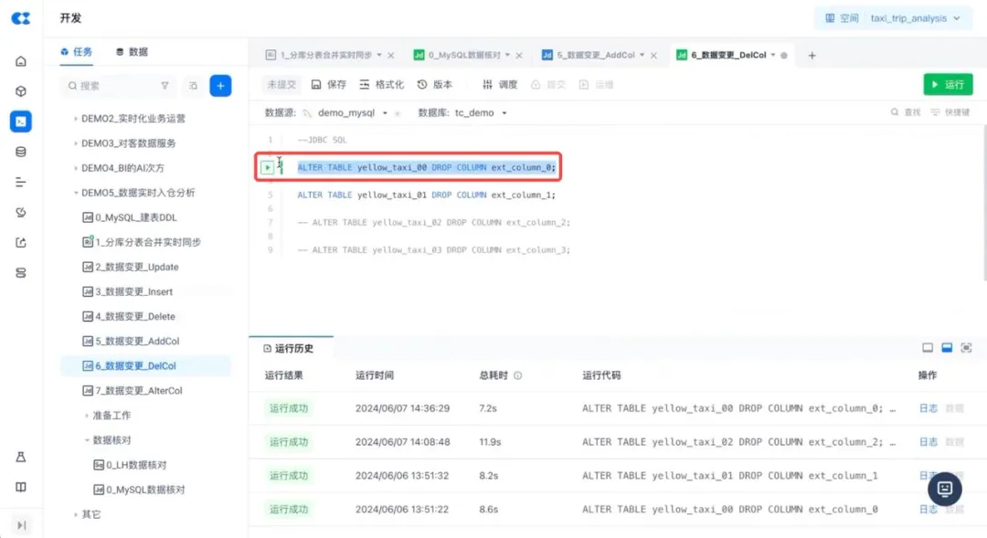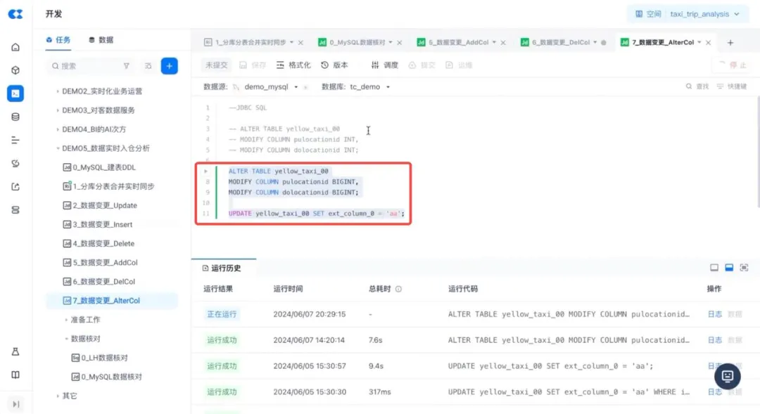 云器Lakehouse产品支持直接操纵源端数据库,通过 SQL 来对源端数据库进行修改、查询等操作,首先我们对源端数据进行变更,先在源端添加一些新的字段:ext_column_0 & ext_column_1,并在源端表里删掉一个字段,同时更改一个字段类型从 int 改为 bigint 。