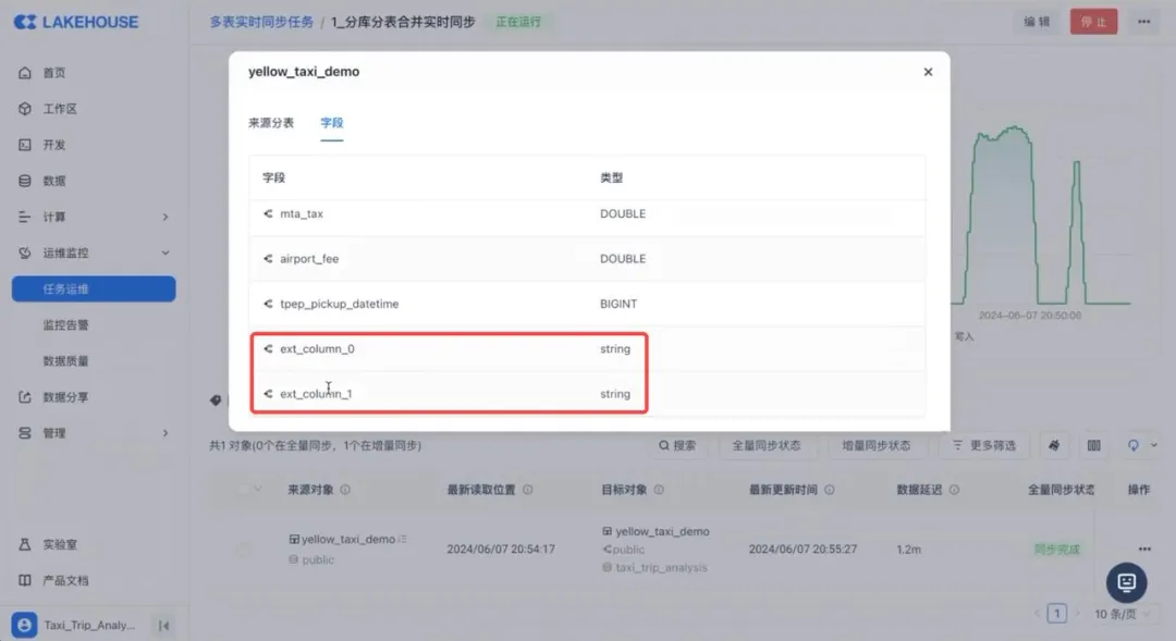 同步完成后,也可以在任务运维界面中检查源端的变更是否被成功同步到目标端,可以看到,新增的字段 ext_column_0 & ext_column_1已经被扩展进目标端,更改的 bigint 字段也完成变更。