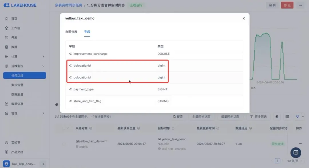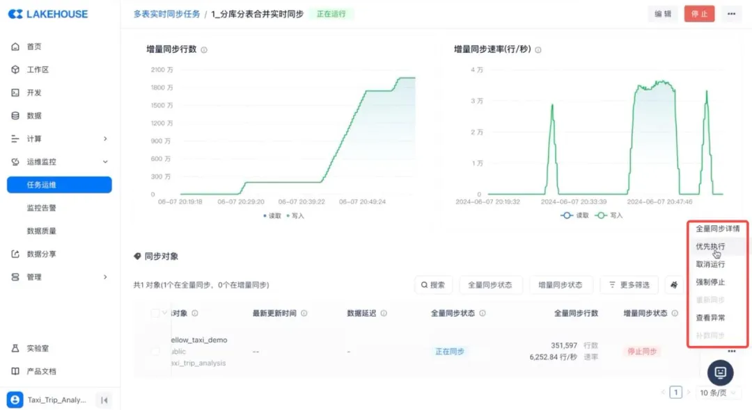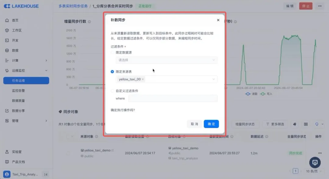 在实际生产过程中,经常会遇到各种各样的复杂问题,为此云器实时同步方案中也提供了多种配套运维处置功能来进行支持。例如在实时同步运行中,源端数据发生了变化,某个表中的数据出现了问题,针对这种情况,我们提供补数同步功能,支持对特定表重新进行全量同步。在业务突发高峰,源端变更流量非常大时,多个表的变更数据的实时同步会相互影响。这两种情况下,都可以通过全量补数同步的功能去加速数据同步过程。以下图为例,对源端表 yellow_taxi_00 表重新进行补数全量同步,其增量实时同步会被暂停,后台会通过全量的方式把源端数据重新同步。补数修订的全量同步完成后,增量同步会自动启动,无需再手动操作。