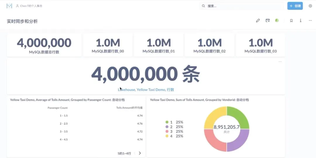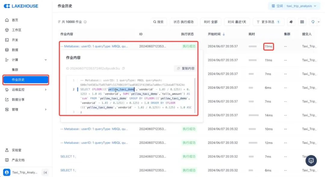通过产品中提供的“作业历史”产品模块,可以看到提交到Lakehouse引擎的所有 SQL 明细。从下图中可以看到,实时同步写入的是 yellow_taxi_demo 表,在Metabase BI 看板里实时查询的也是该表。而且在演示的这个相对复杂的查询条件下,进行了400万行数据的全表扫描,能在 11 毫秒就返回查询结果。云器Lakehouse的方案不需要新增额外的加速引擎来进行查询加速,省去了再同步复制一份数据,所以能够极大地节约整体成本。