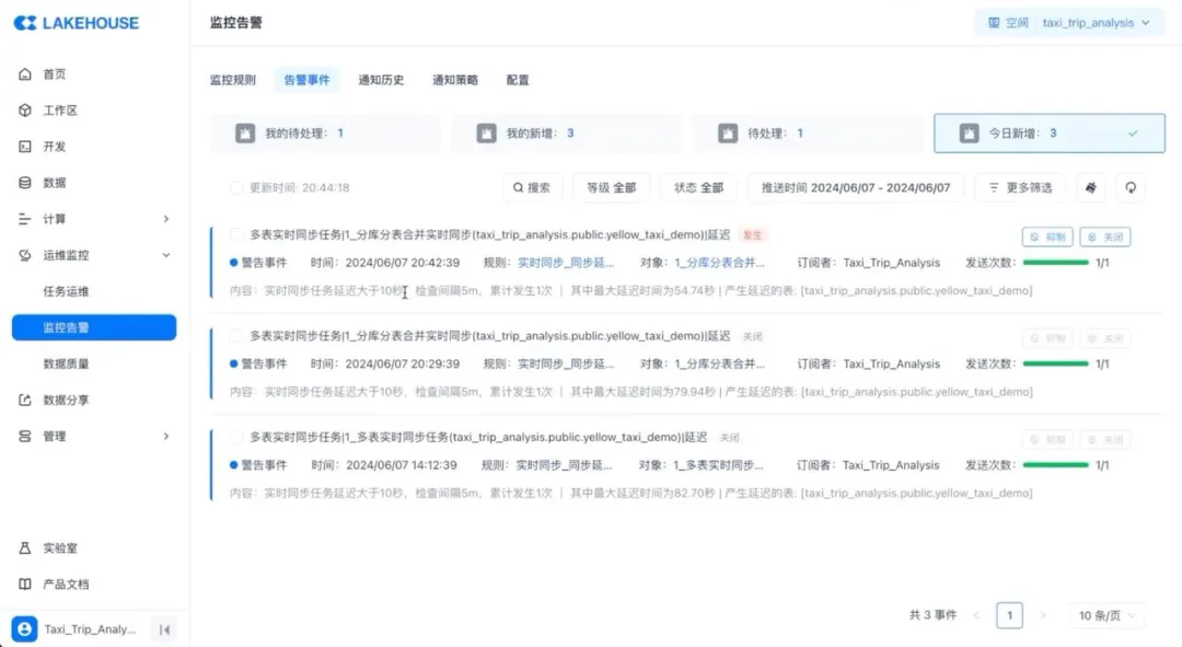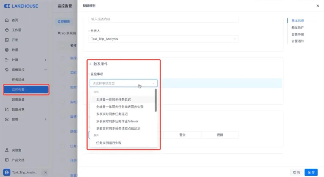 云器Lakehouse提供了监控告警产品模块,内置了丰富的状态和指标监控能力,支持自定义配置监控规则,来全面监控整个任务运行的状态,包括任务实例运行失败、单表存量数据同步异常、实时同步任务端到端延迟、作业 failover 、源端数据读取的点位延迟等等,一系列的监控事项,都可以通过配置对应的规则给监控起来。